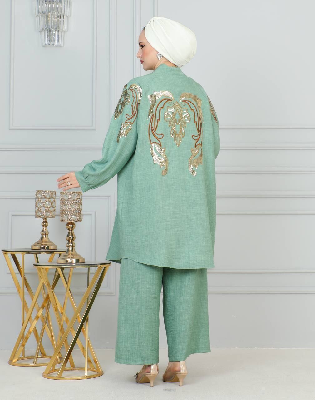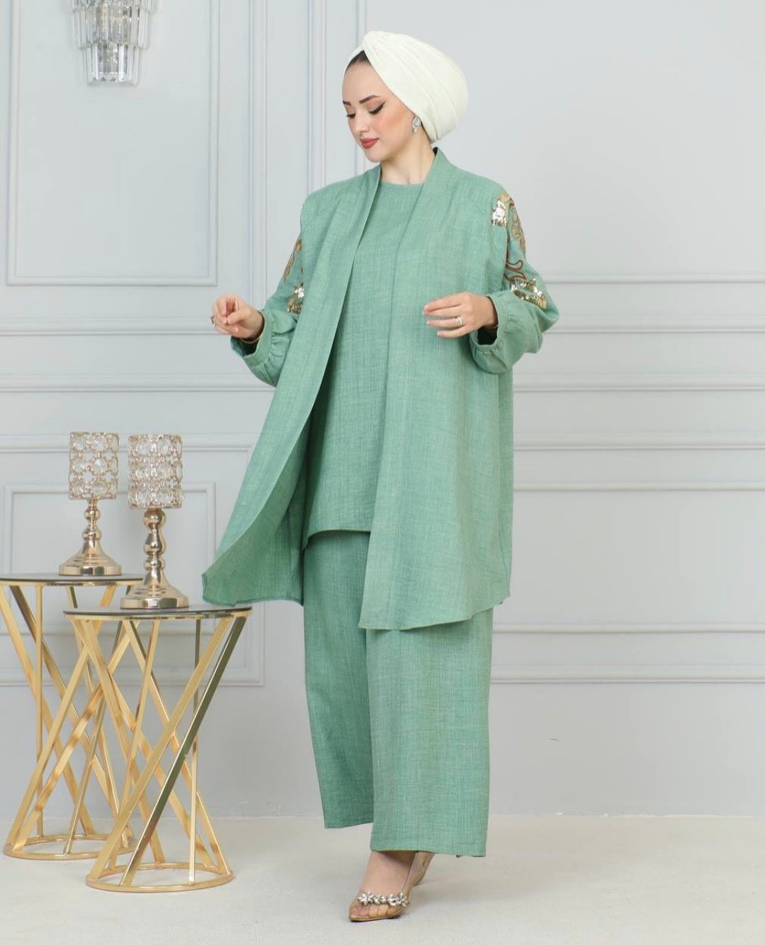 طقم 3 قطع بلون أخضر فاتح مزين بالترتر الذهبي للمقاسات الكبيرة