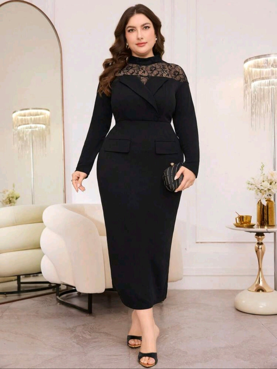 فستان أسود مزين بالدنتال في الصدر مع أكمام طويلة