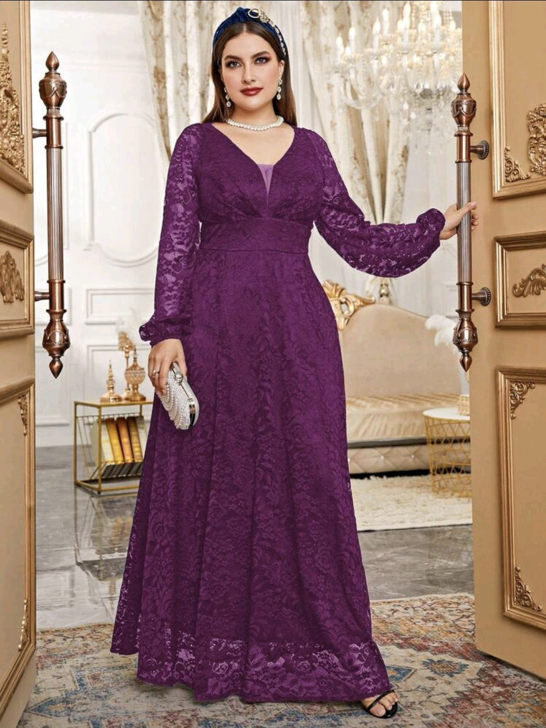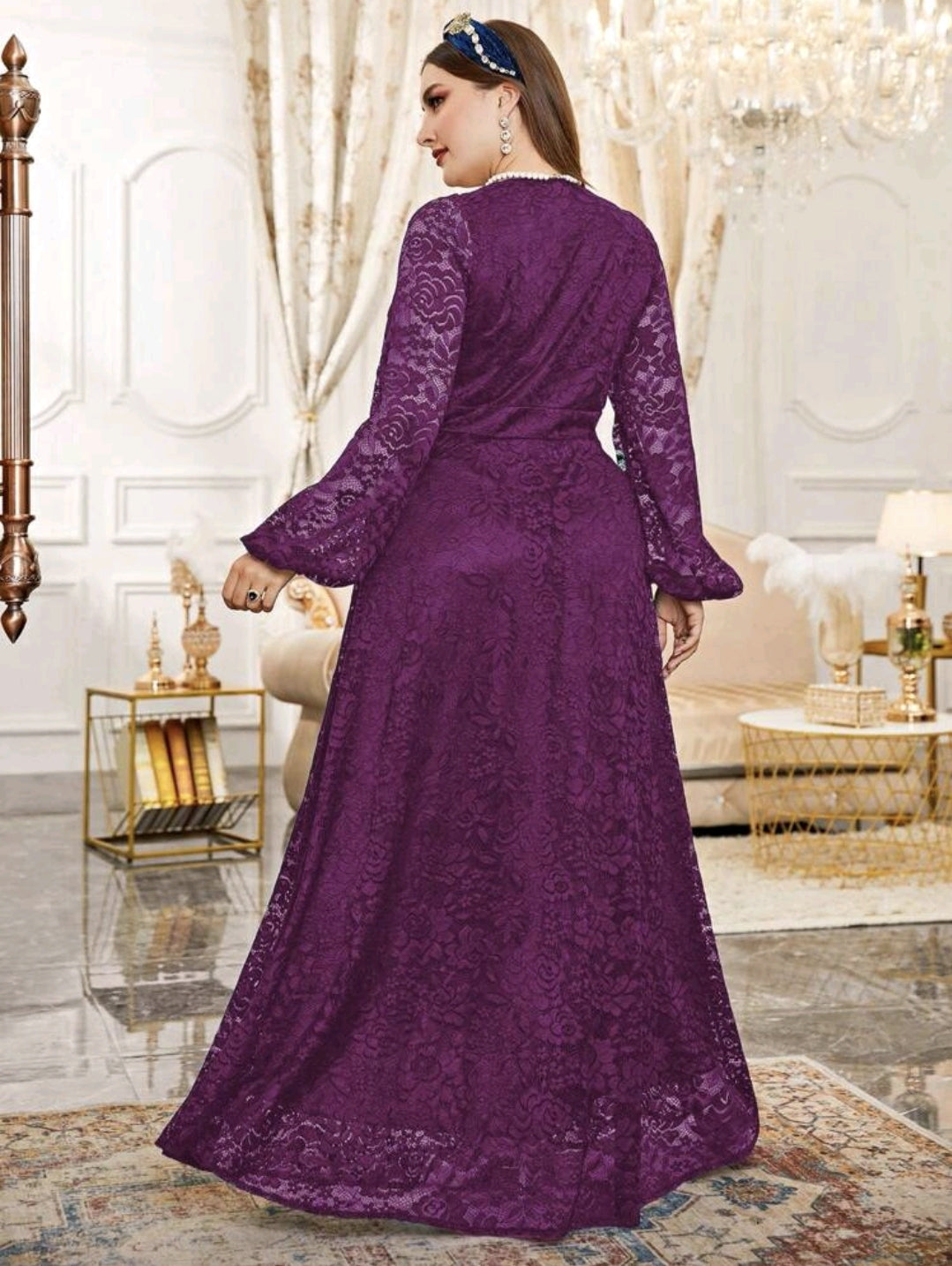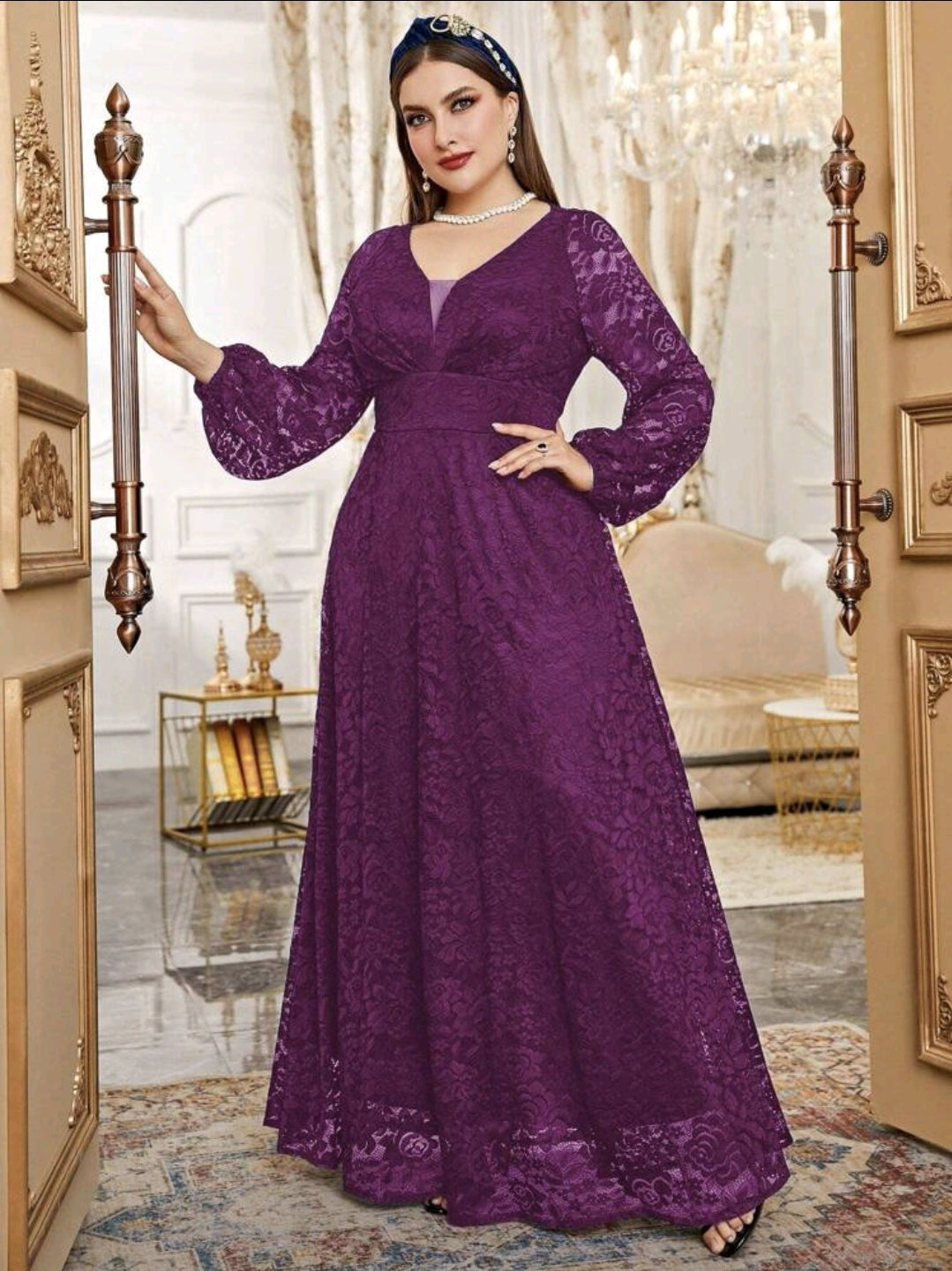 فستان بنفسجي طويل بأكمام فانوس شبكية متباينة من الدانتيل