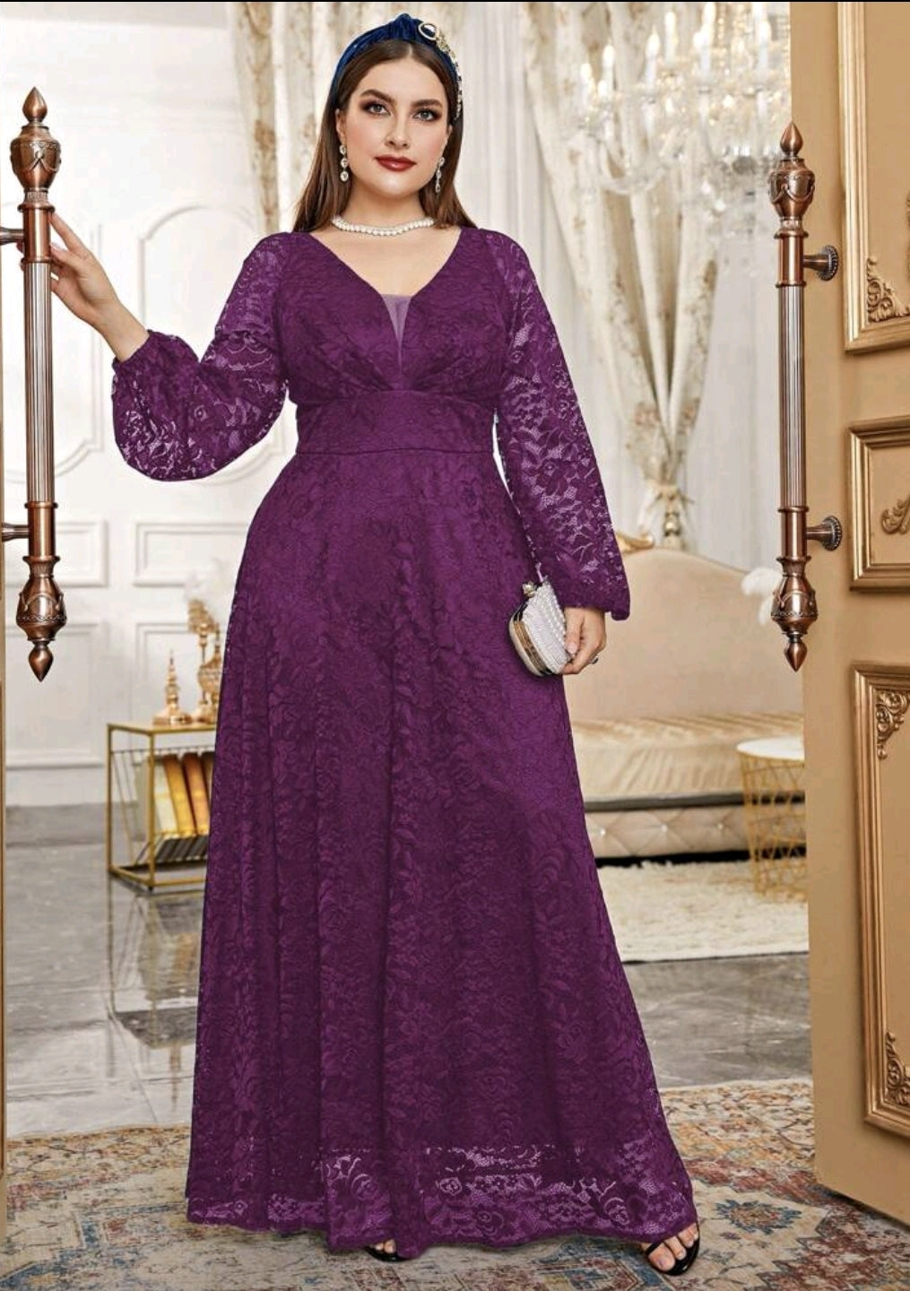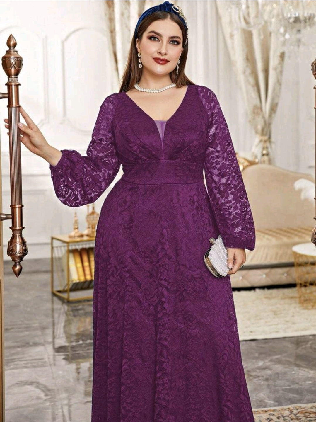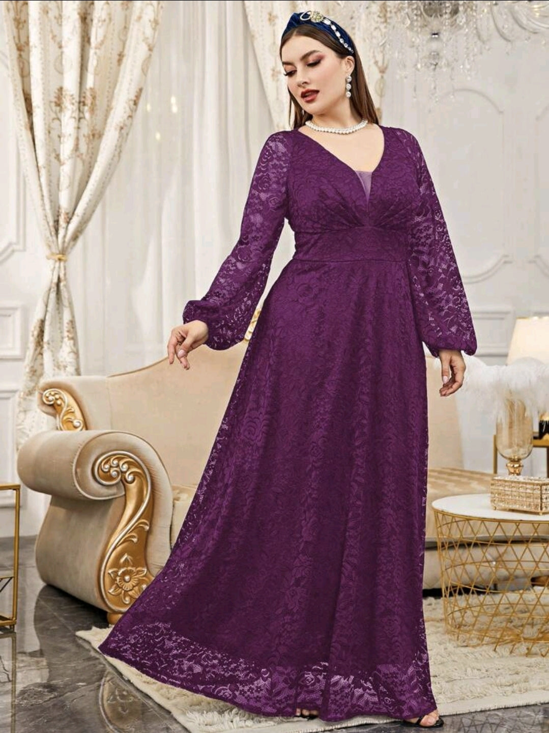 فستان بنفسجي طويل بأكمام فانوس شبكية متباينة من الدانتيل
