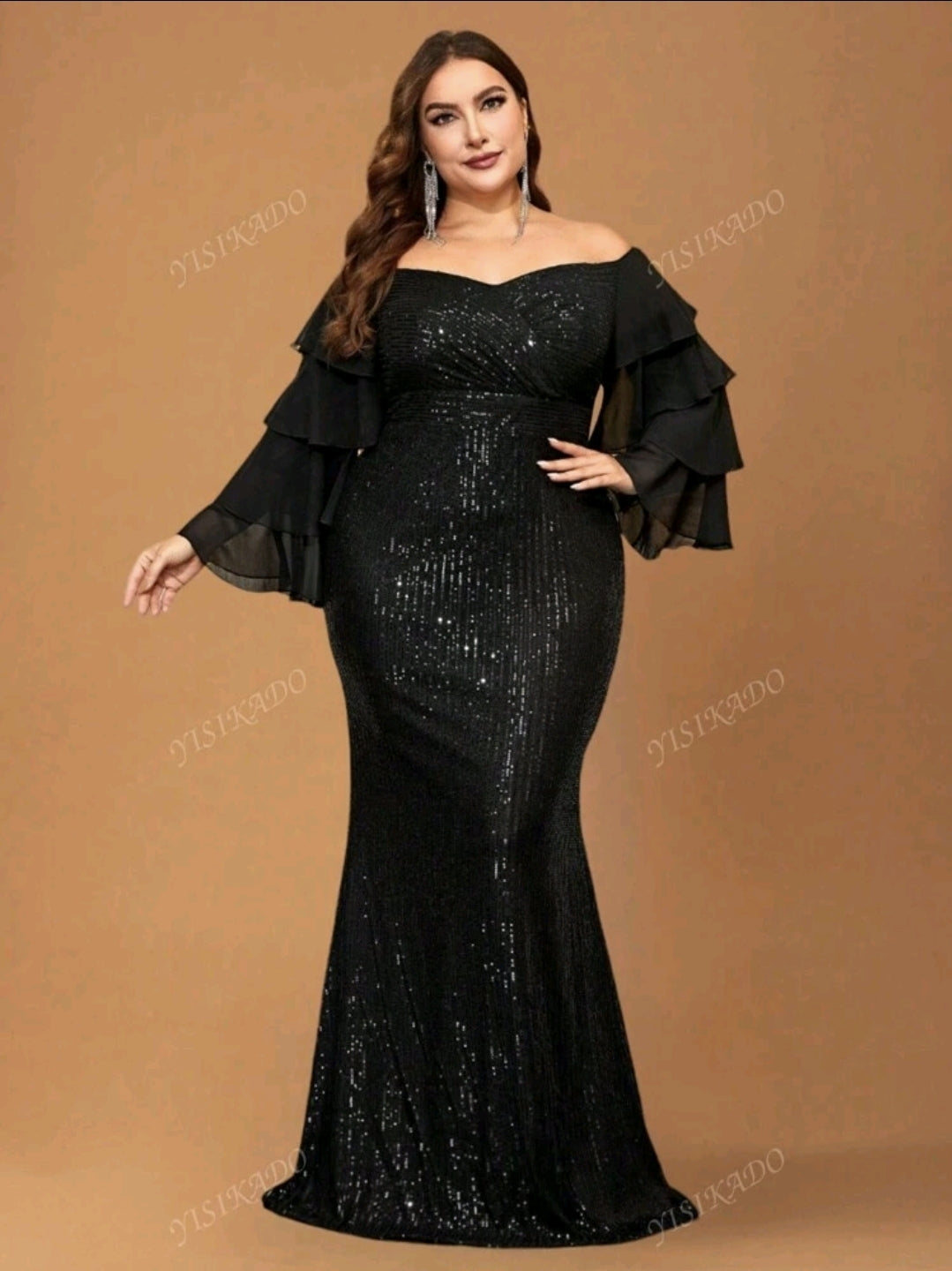 فستان سهرة أسود طويل أنيق بأكمام طويلة، وفتحة صدر مكشوفة، وكشكشة، وحاشية حورية البحر مطرز بالترتر.