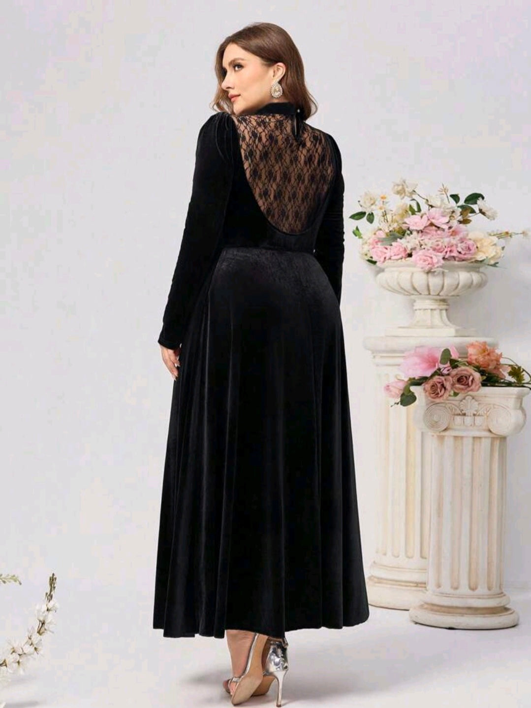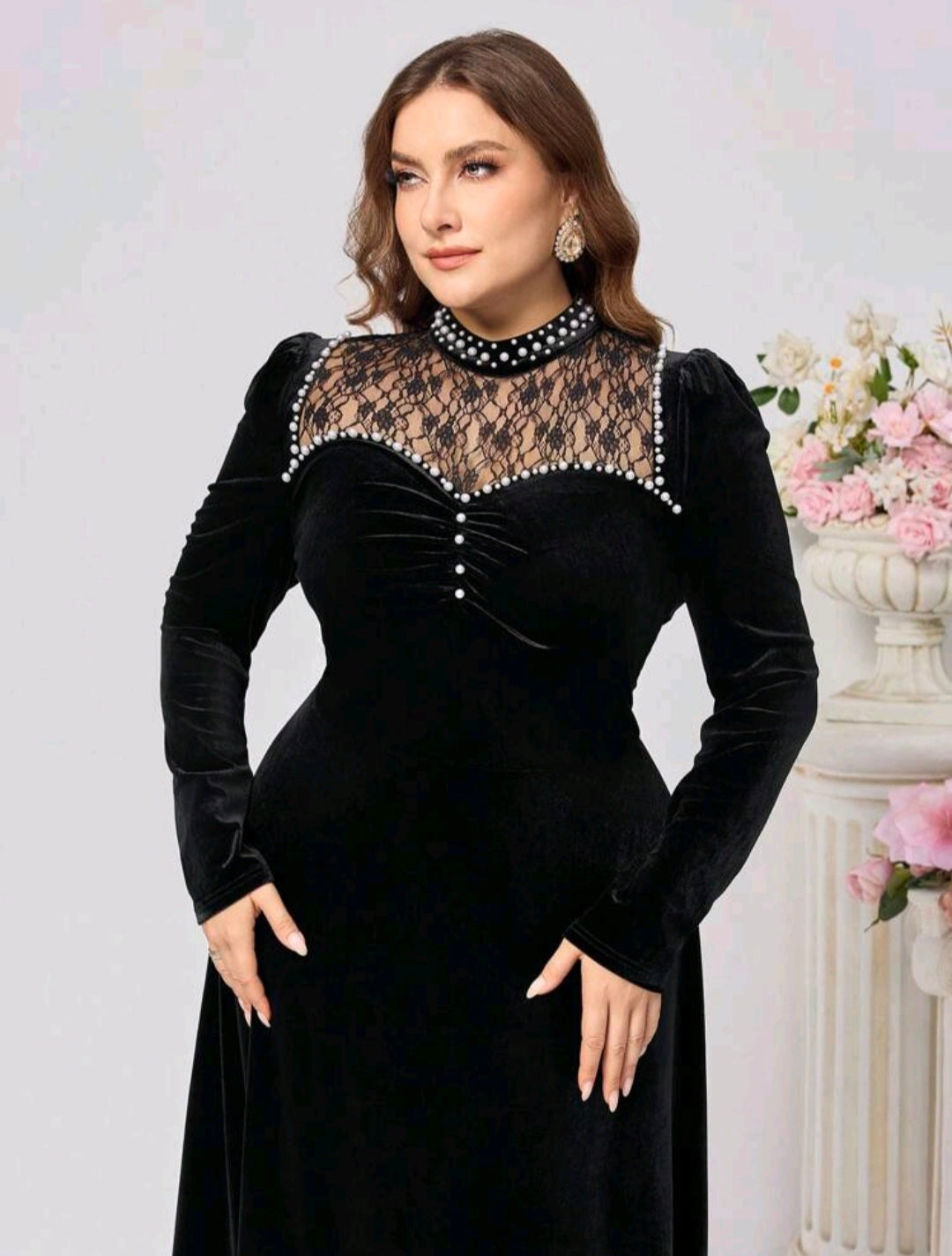 فستان سهرة أسود مخملي أنيق بمقاس كبير مع أكمام طويلة ورقبة متباينة من الدانتيل و مزينة بأحجار كالؤلؤ الابيض