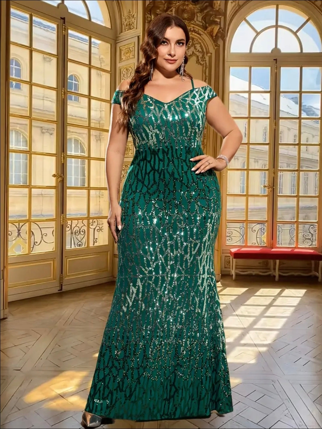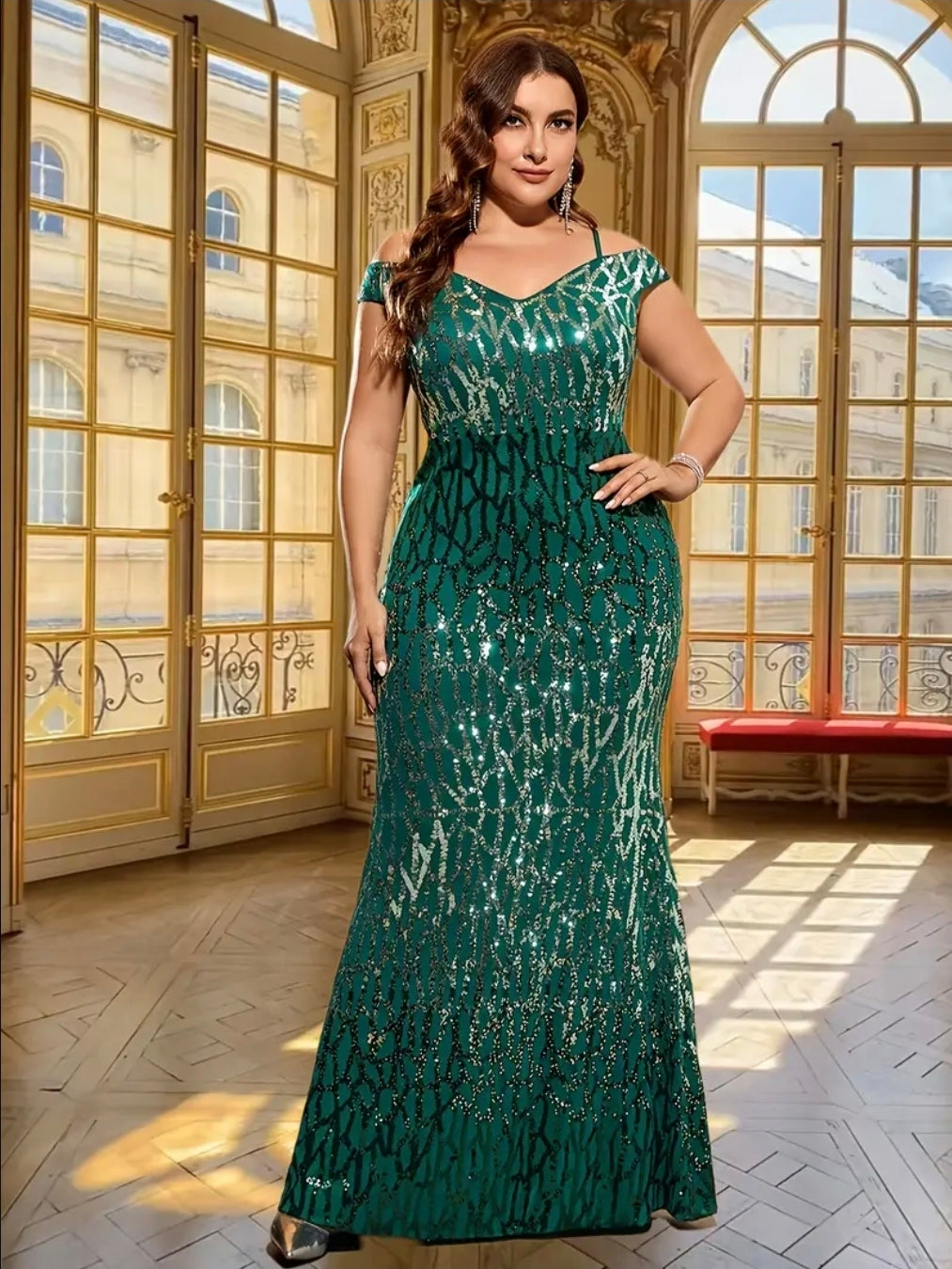 فستان سهرة أنيق مزين بالترتر للنساء بمقاسات كبيرة - أخضر زمردي، حمالات رفيعة، أكمام قصيرة وذيل طويل و تفاصيل من الخرز