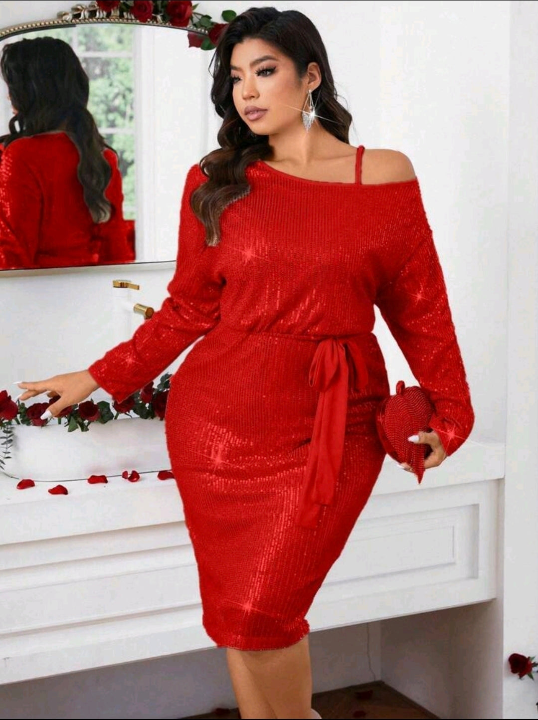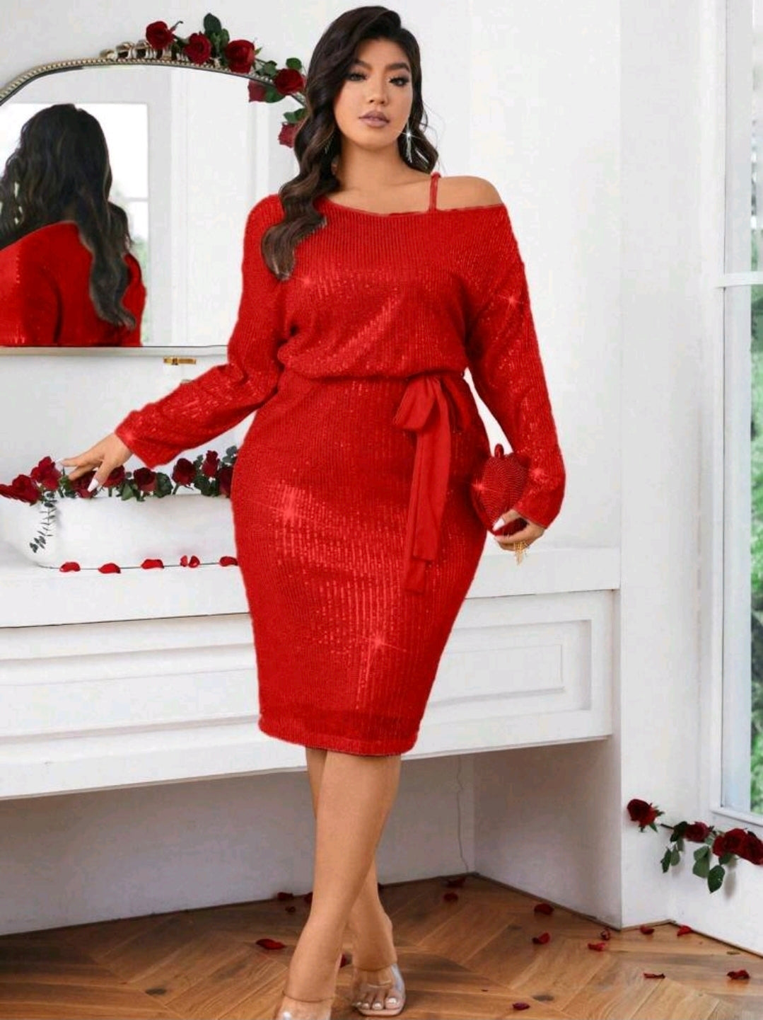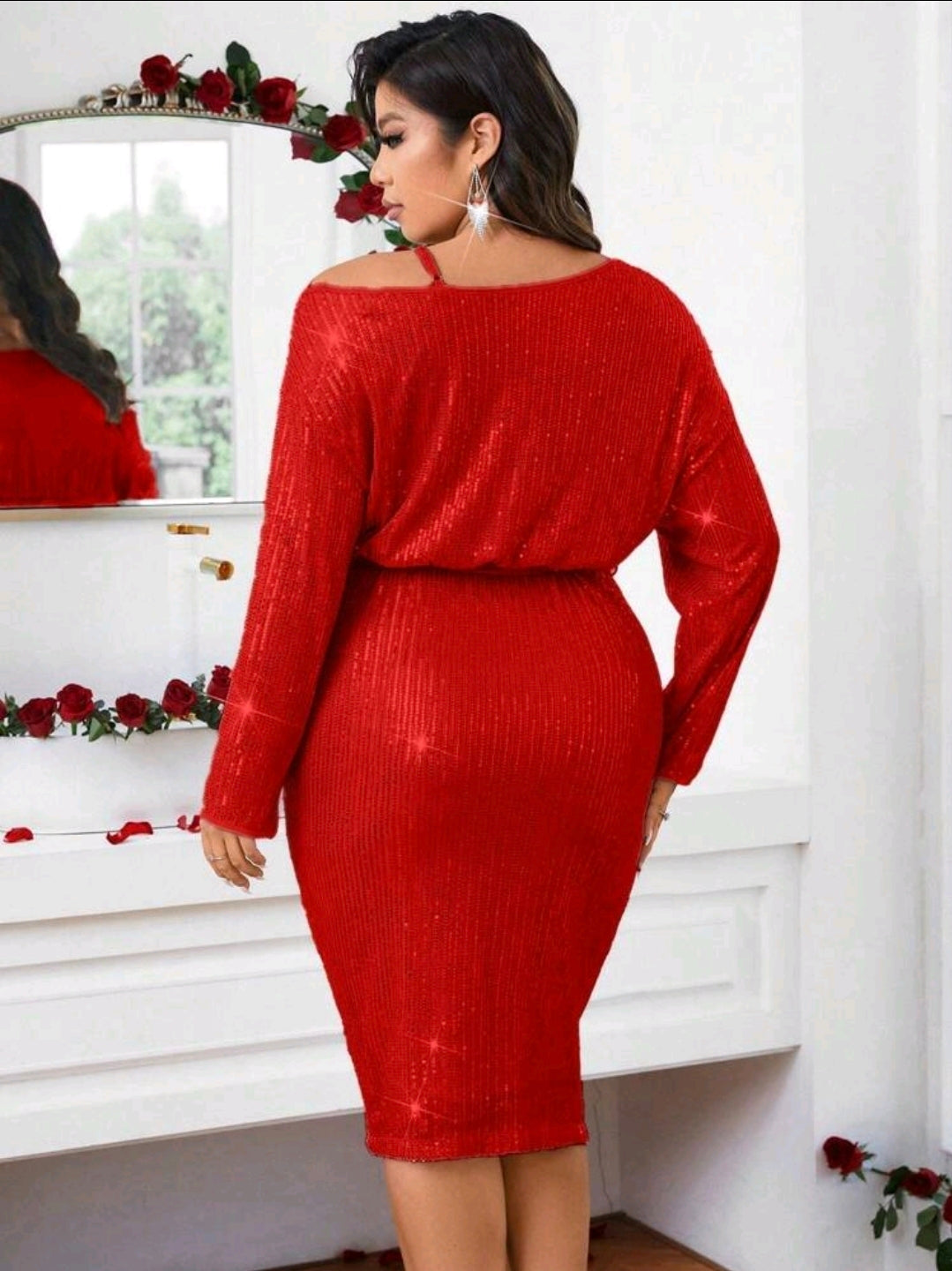 فستان ضيق أنيق بلون واحد، مزين بالترتر، بفتحة رقبة و أكمام طويلة