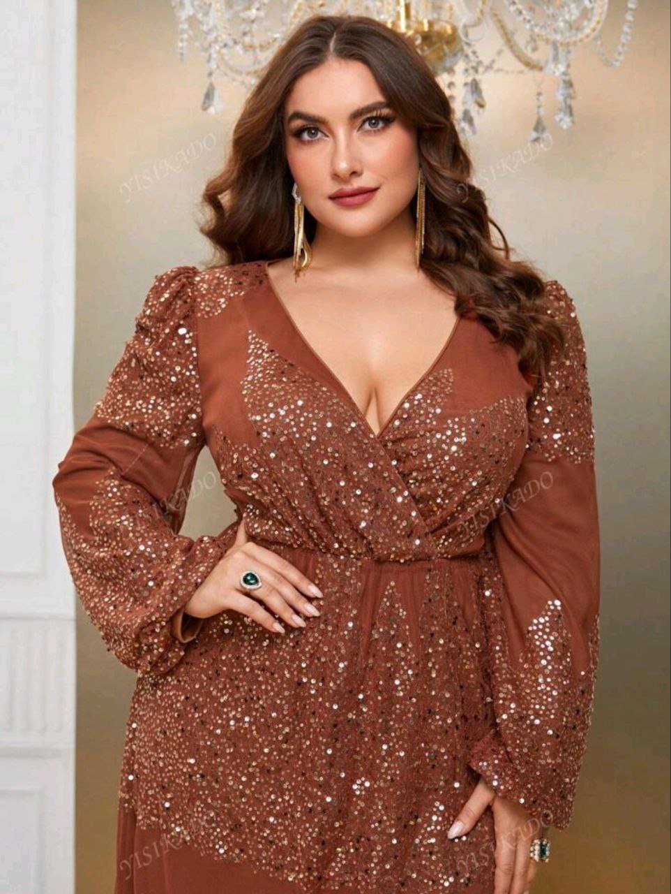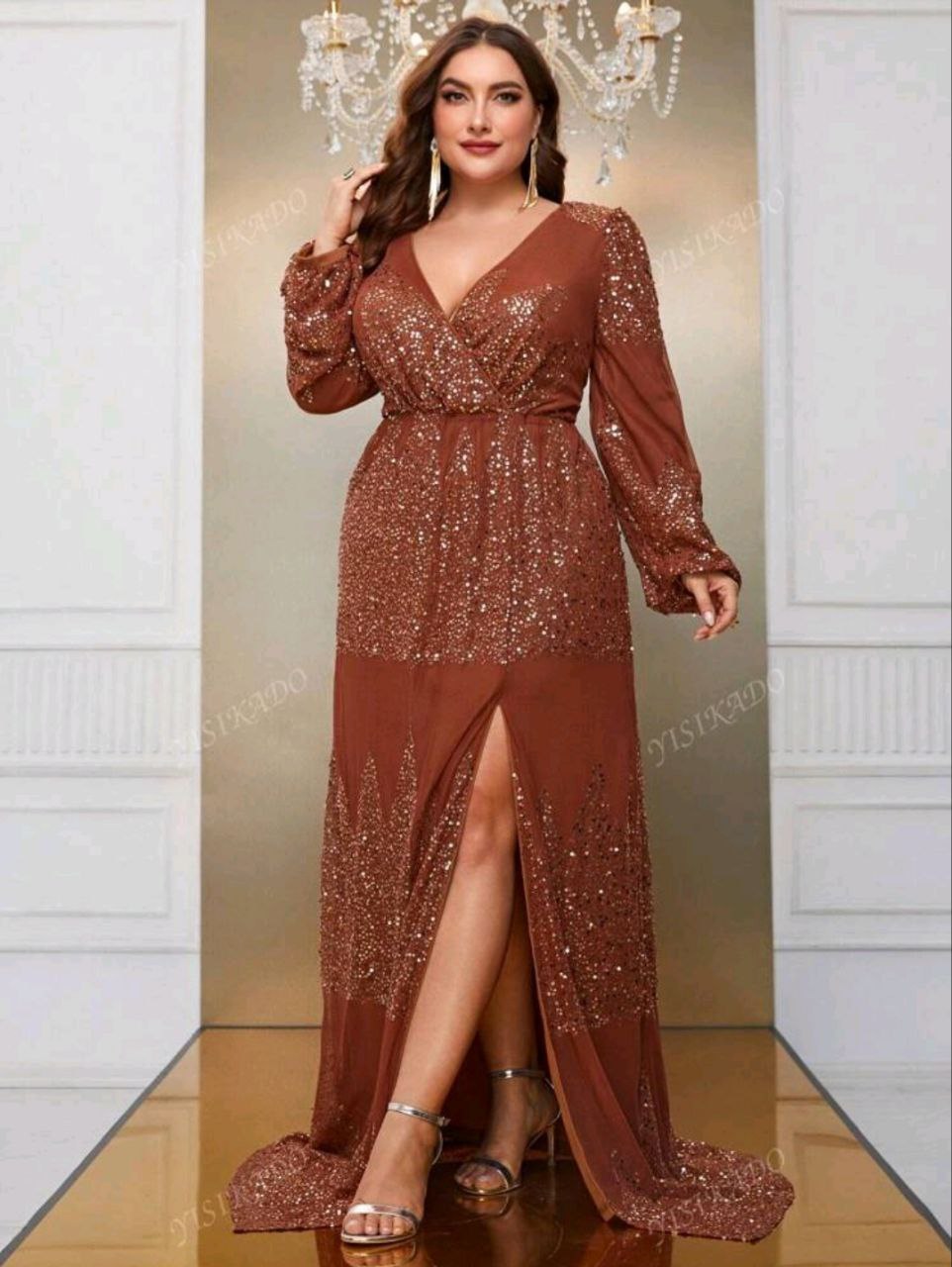 فستان طويل أنيق مزين بالترتر رقبة مفتوحة و أكمام طويلة