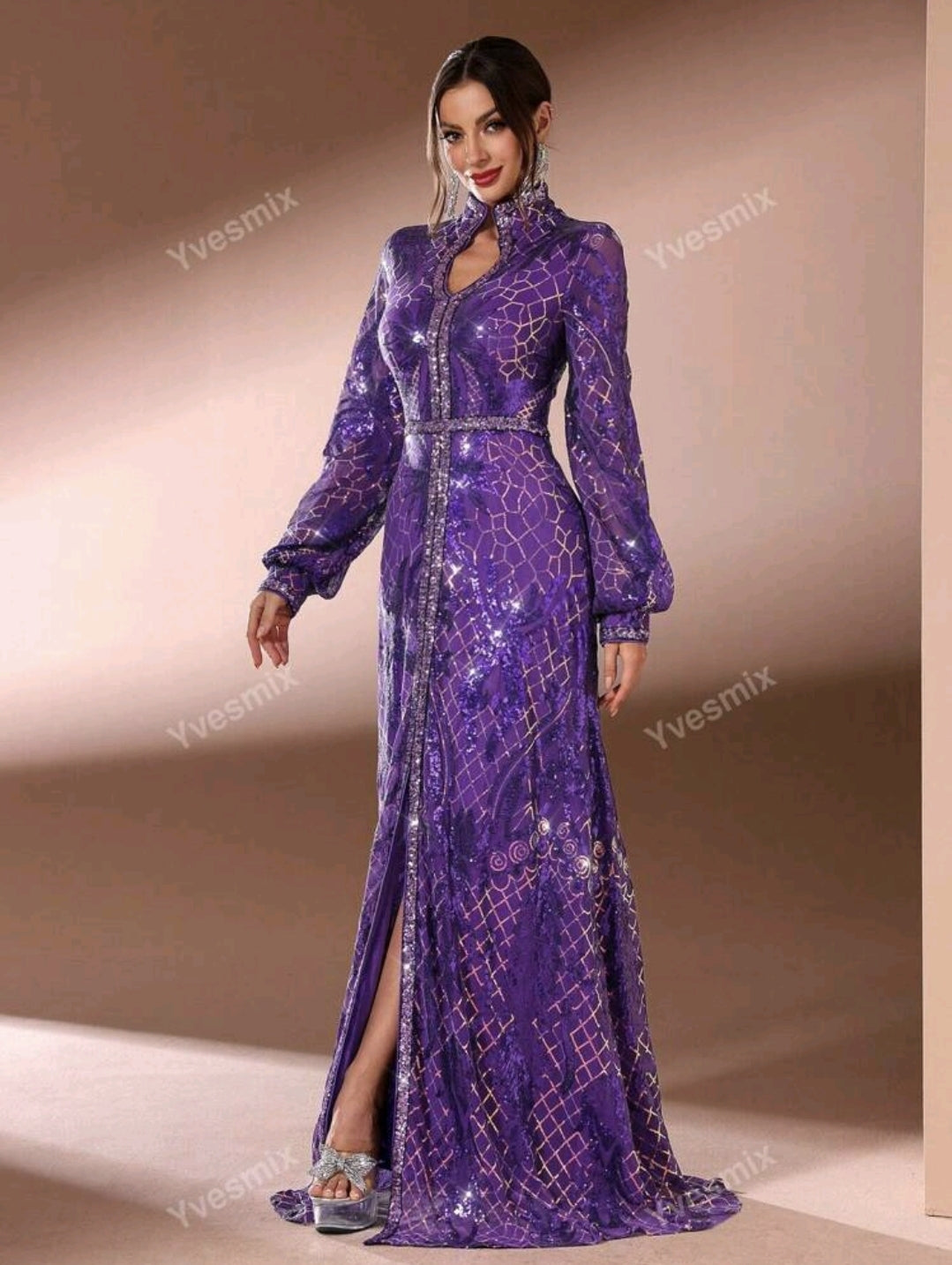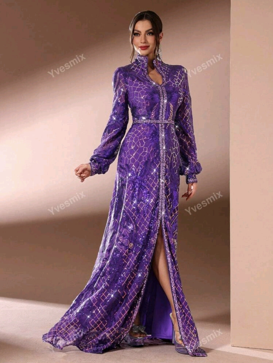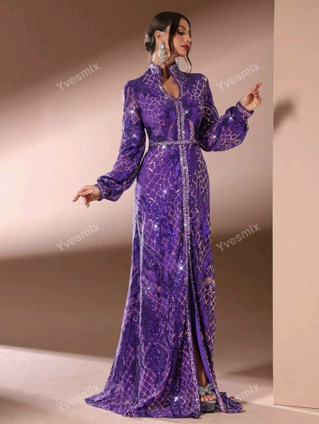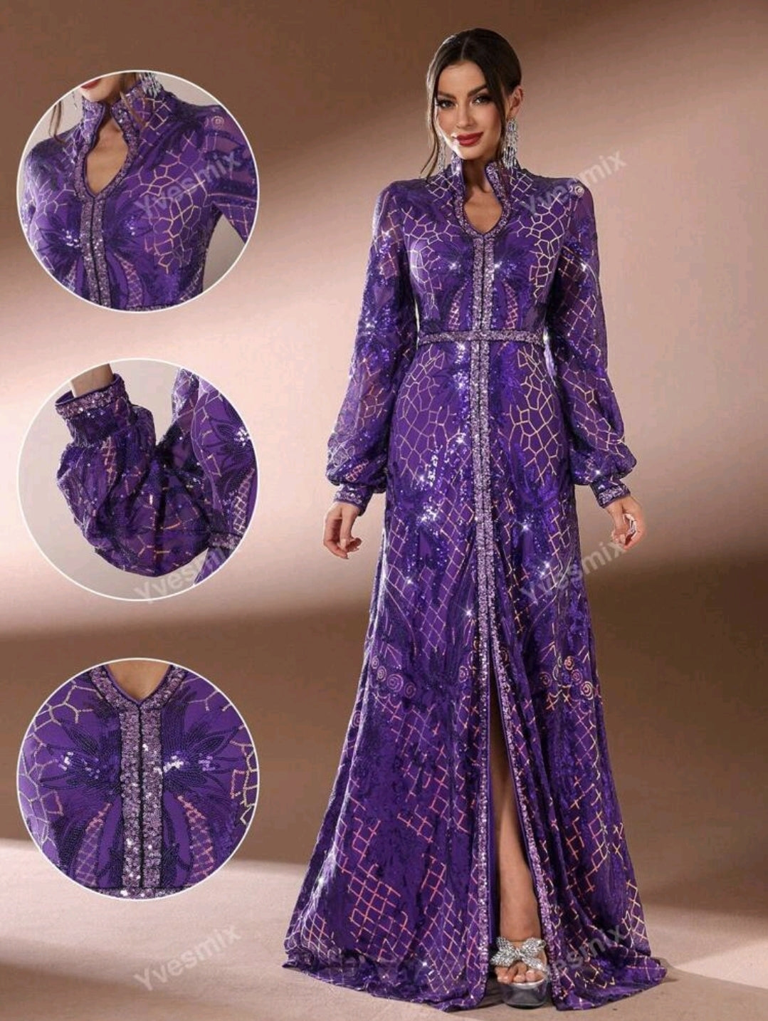 فستان عربي محتشم بأكمام طويلة ورقبة على شكل حرف V مزين بالترتر اللامع