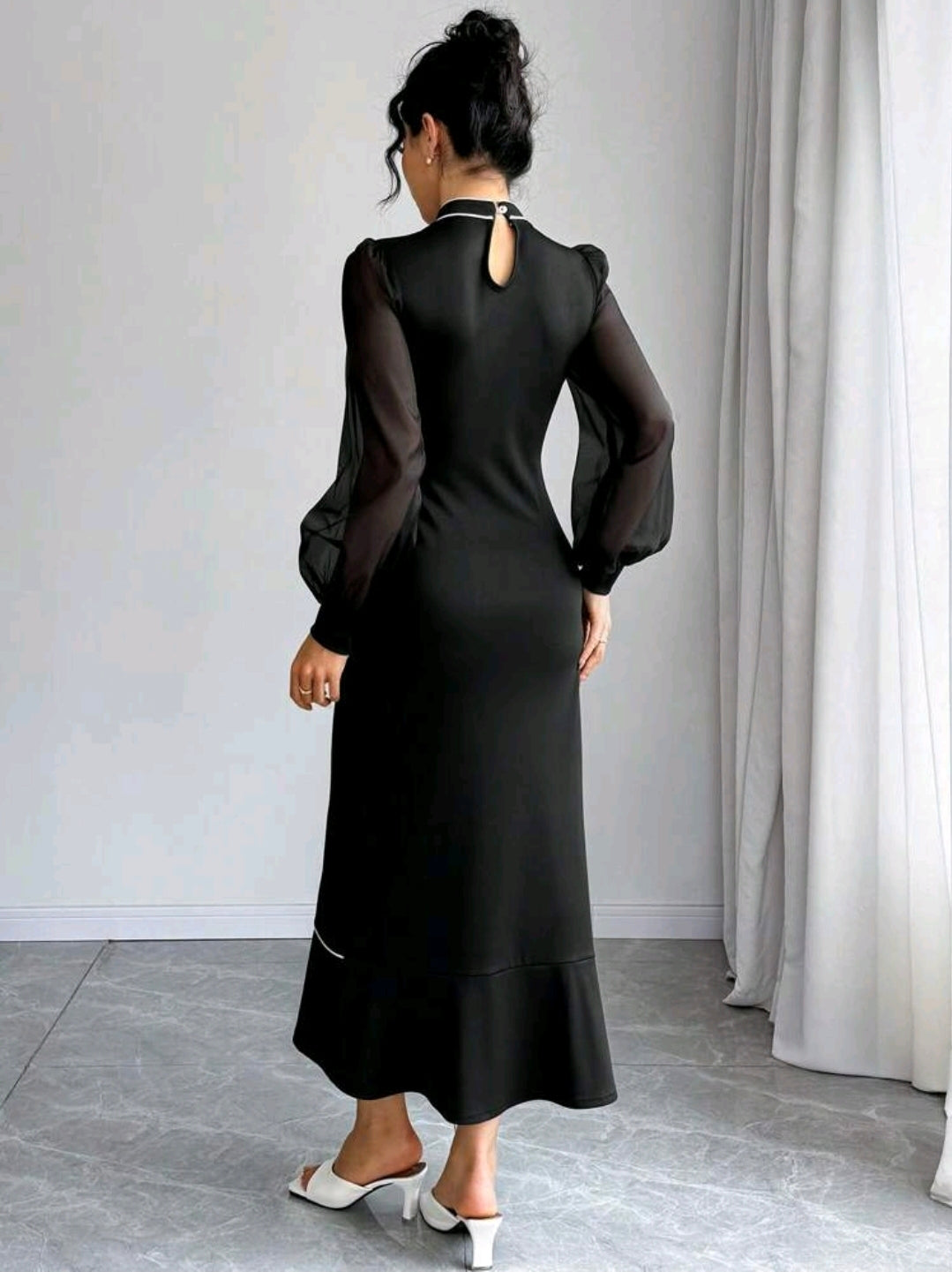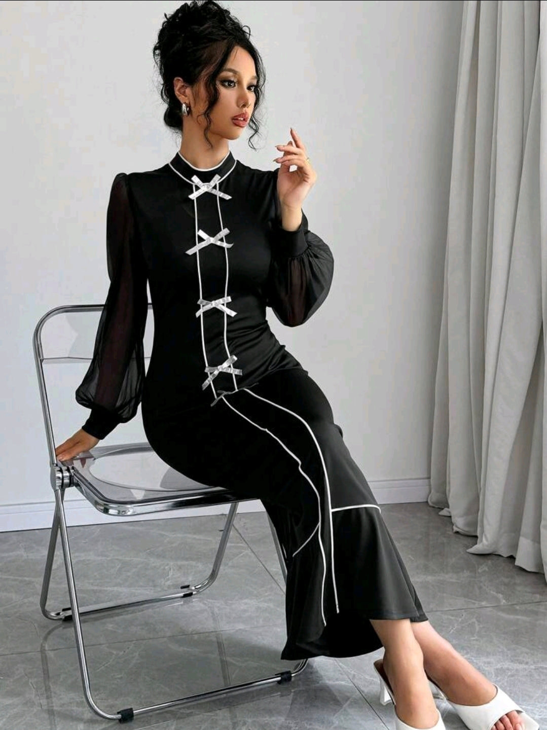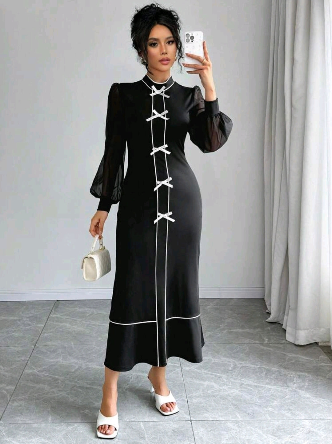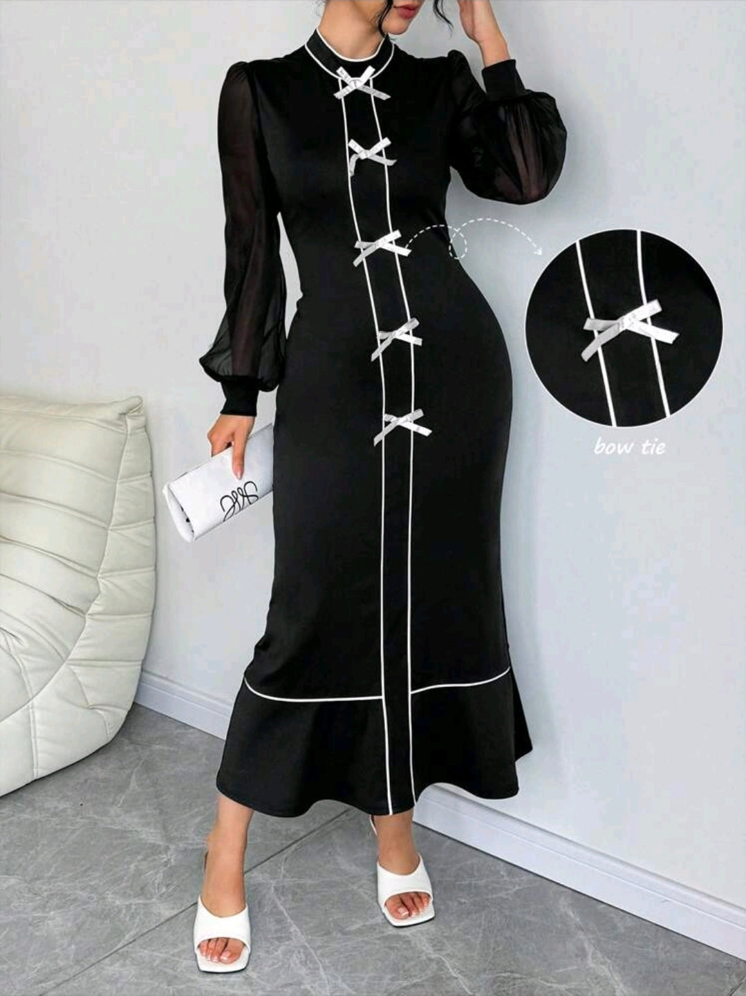 فستان أسود الطويل المحبوك بأكمام فانوس وربطة عنق على شكل فراشة باللون الابيض