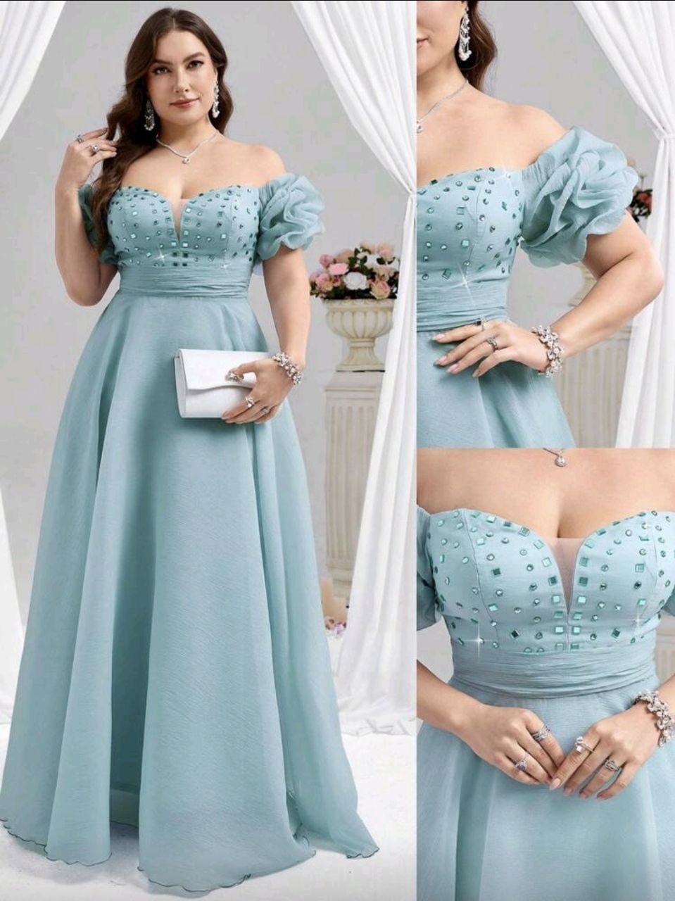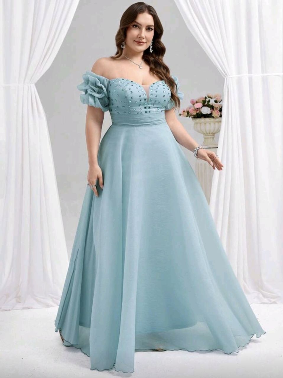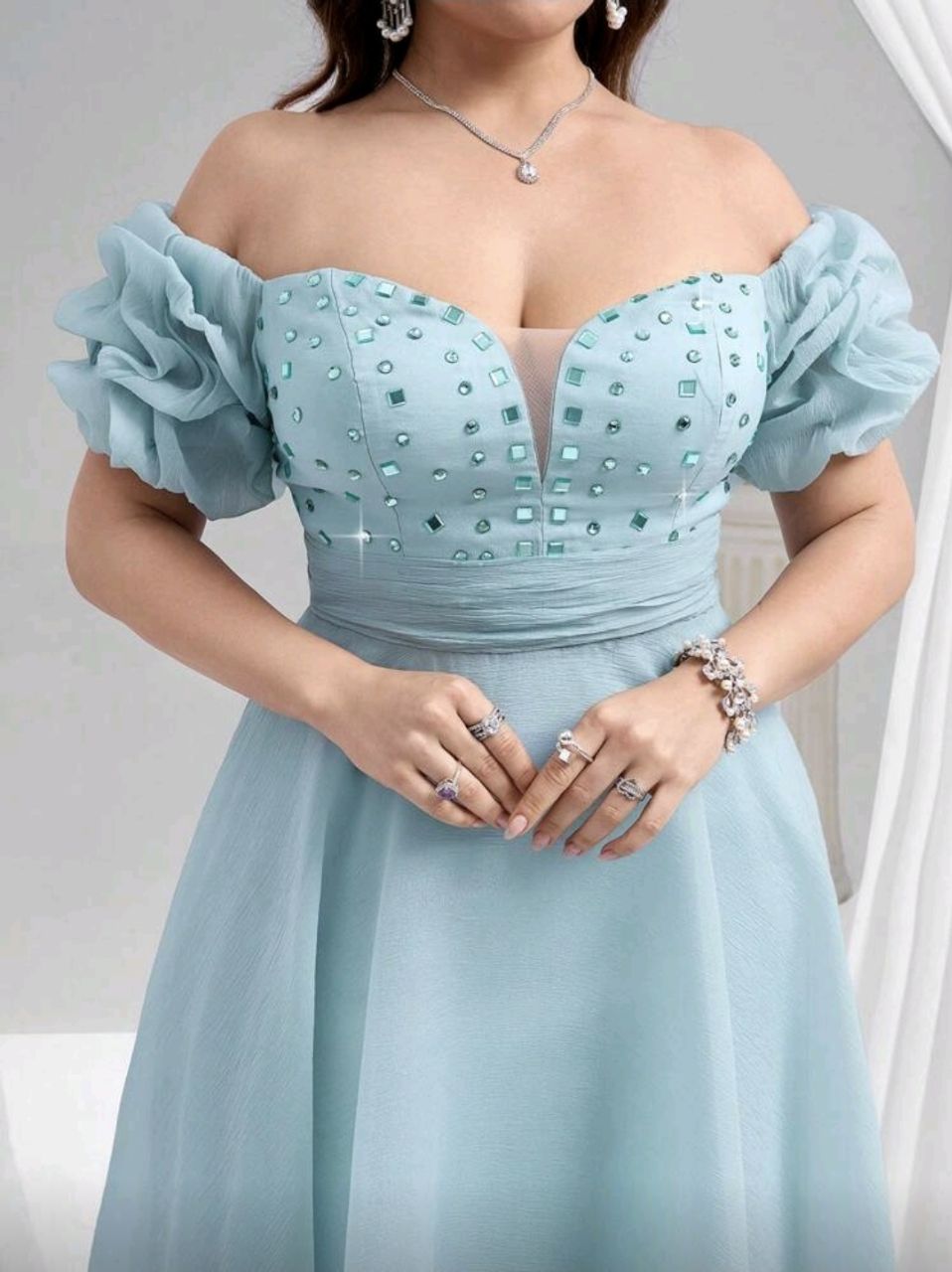 فستان أنيق فاخر بدون أكتاف منقوش بأحجار الراين وفتحة رقبة عميقة وأكمام مكشكشة