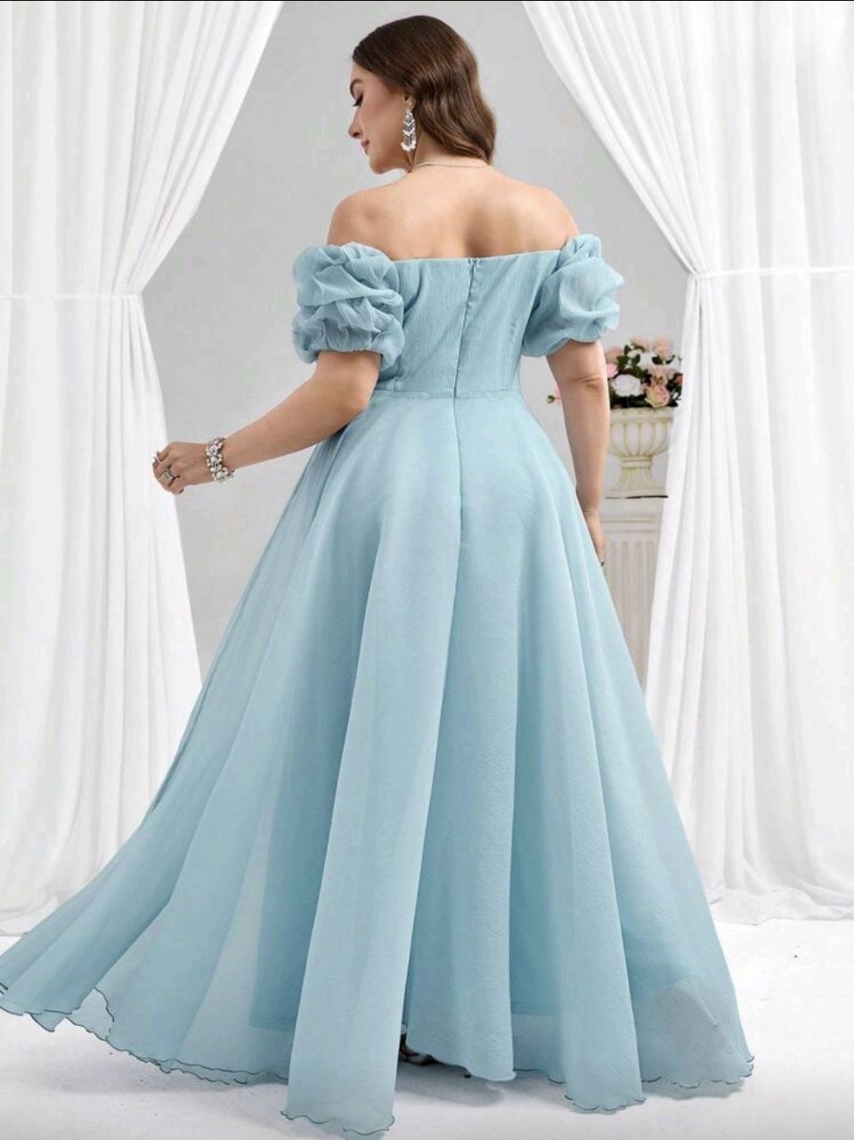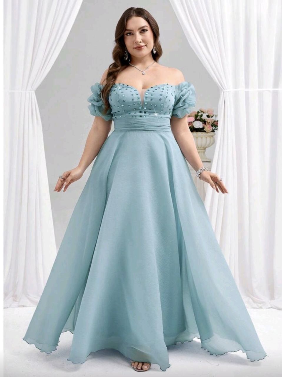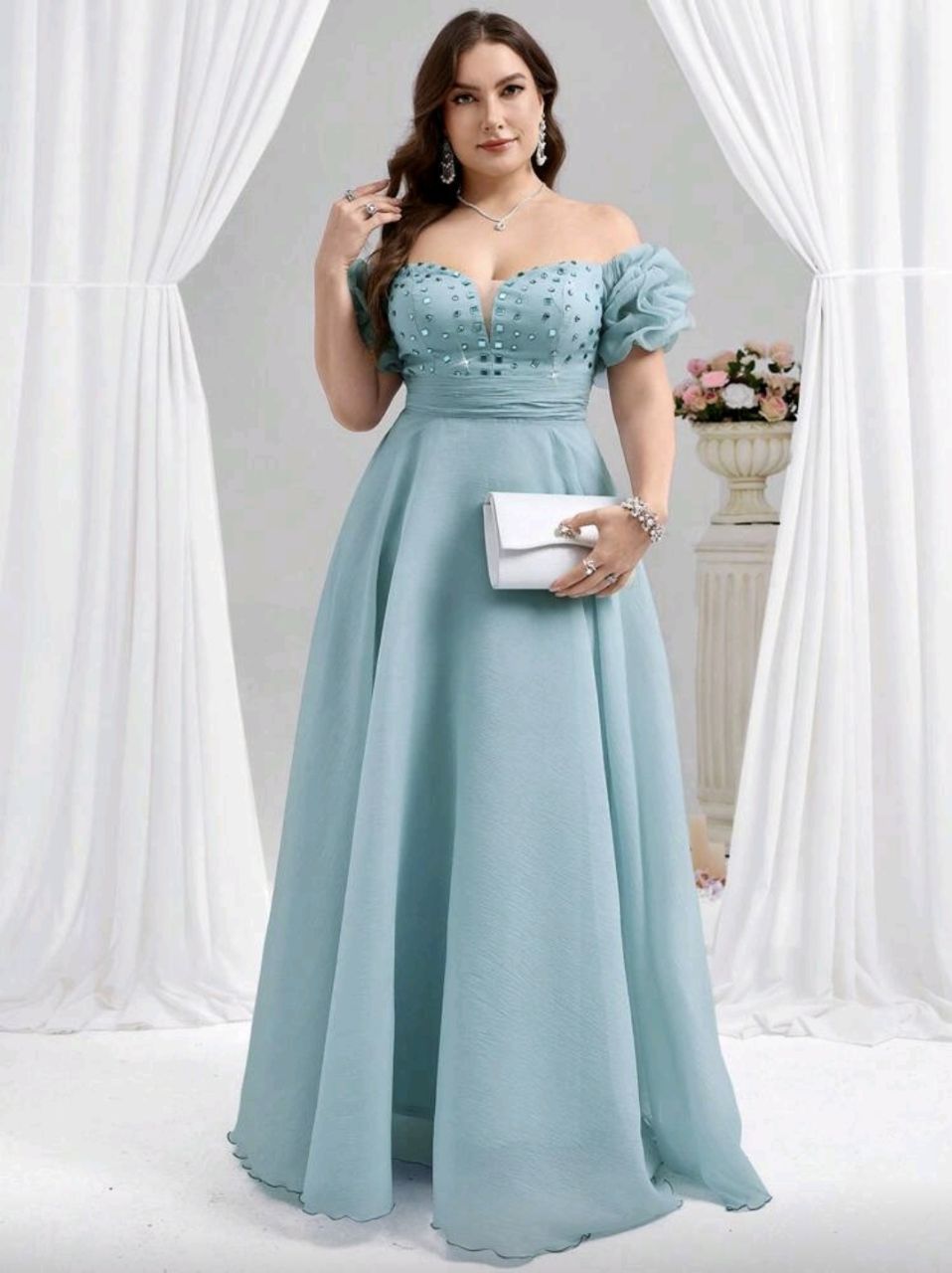 فستان أنيق فاخر بدون أكتاف منقوش بأحجار الراين وفتحة رقبة عميقة وأكمام مكشكشة