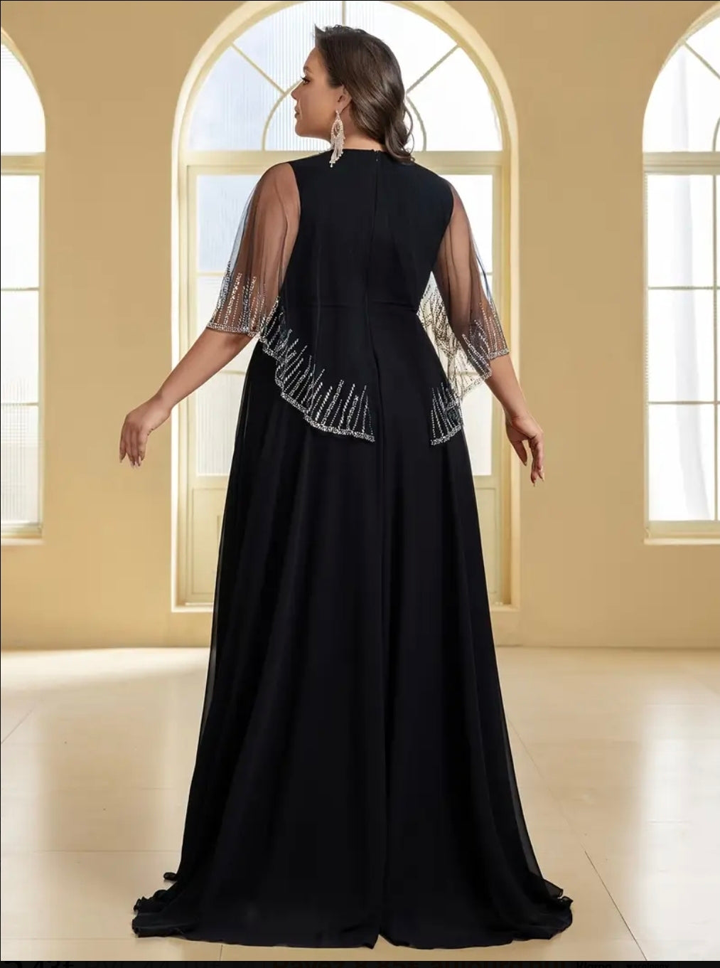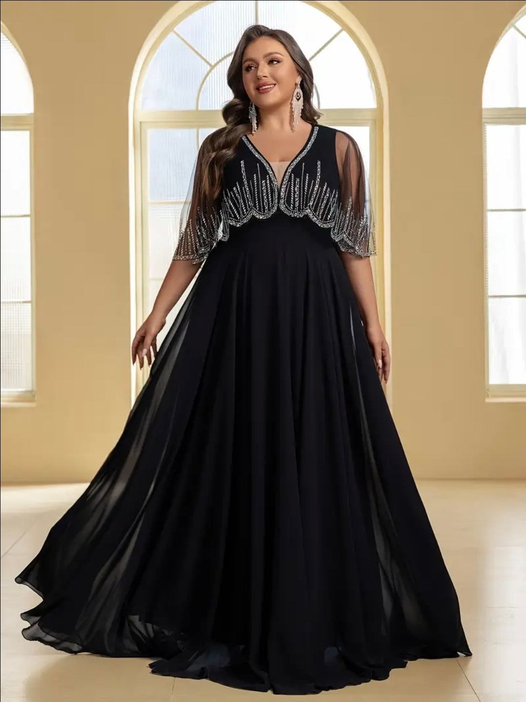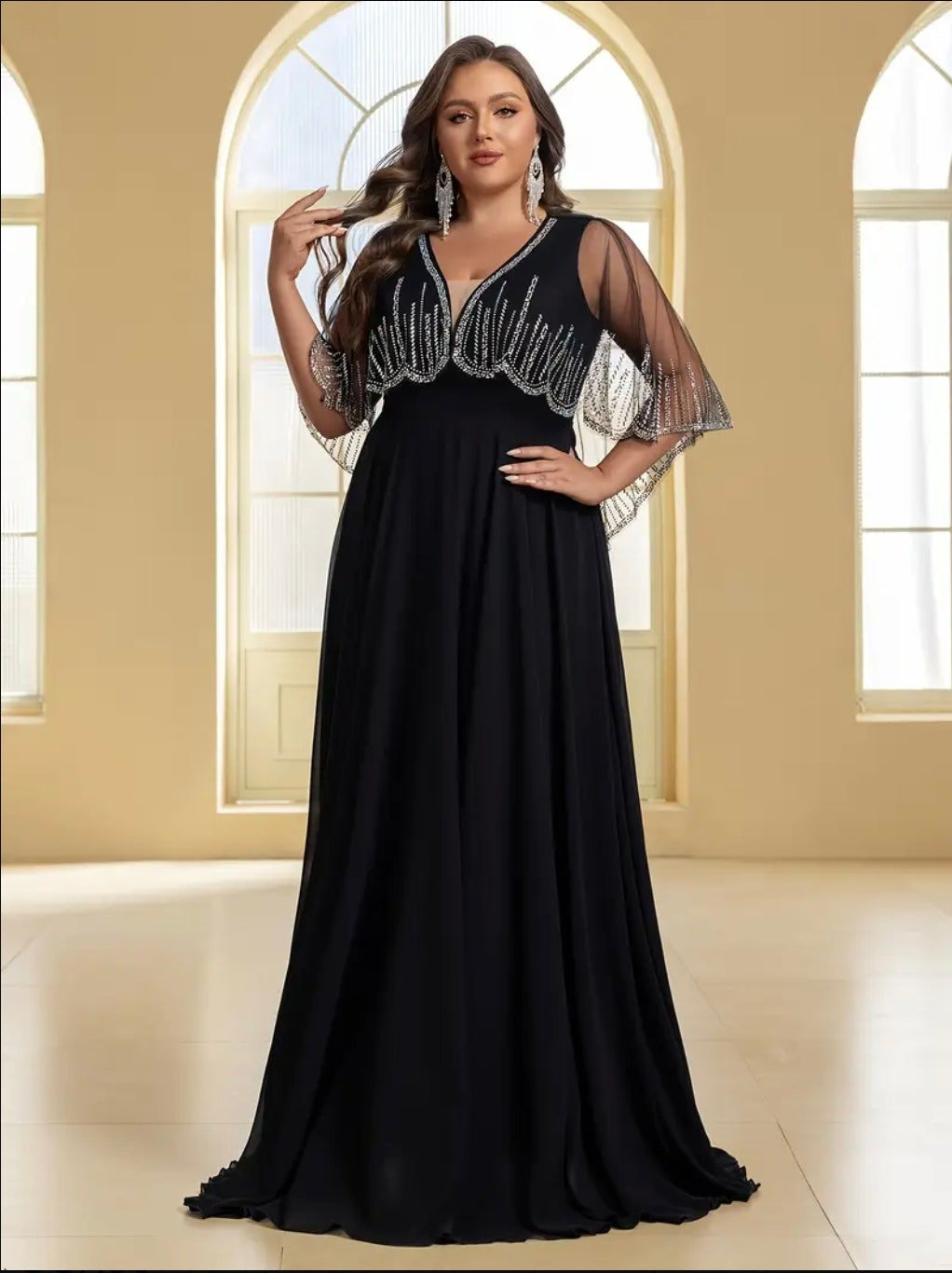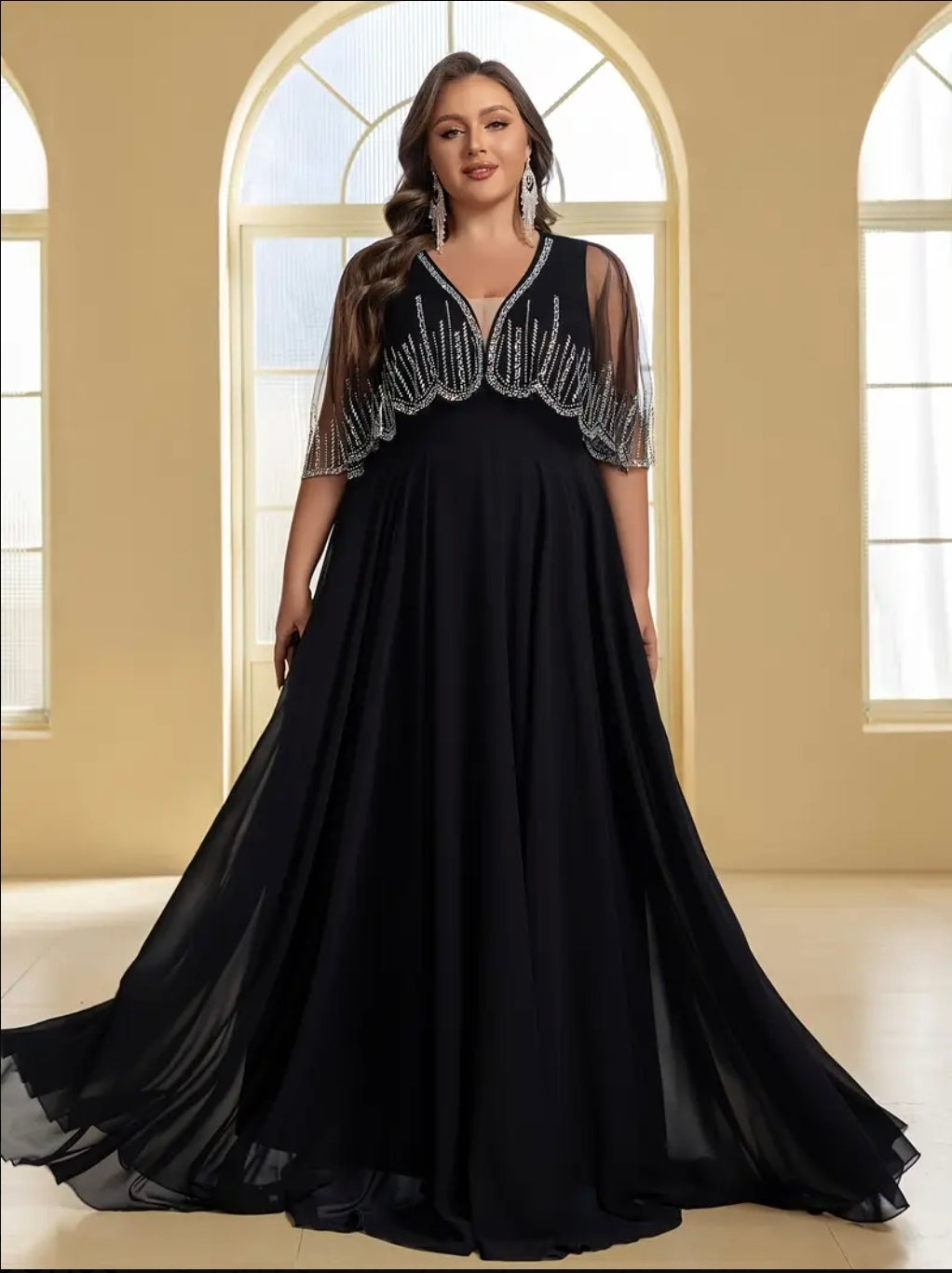 فستان سهرة أنيق من التول مع أحجار الراين، رقبة على شكل حرف V وشال، مقاس كبير
