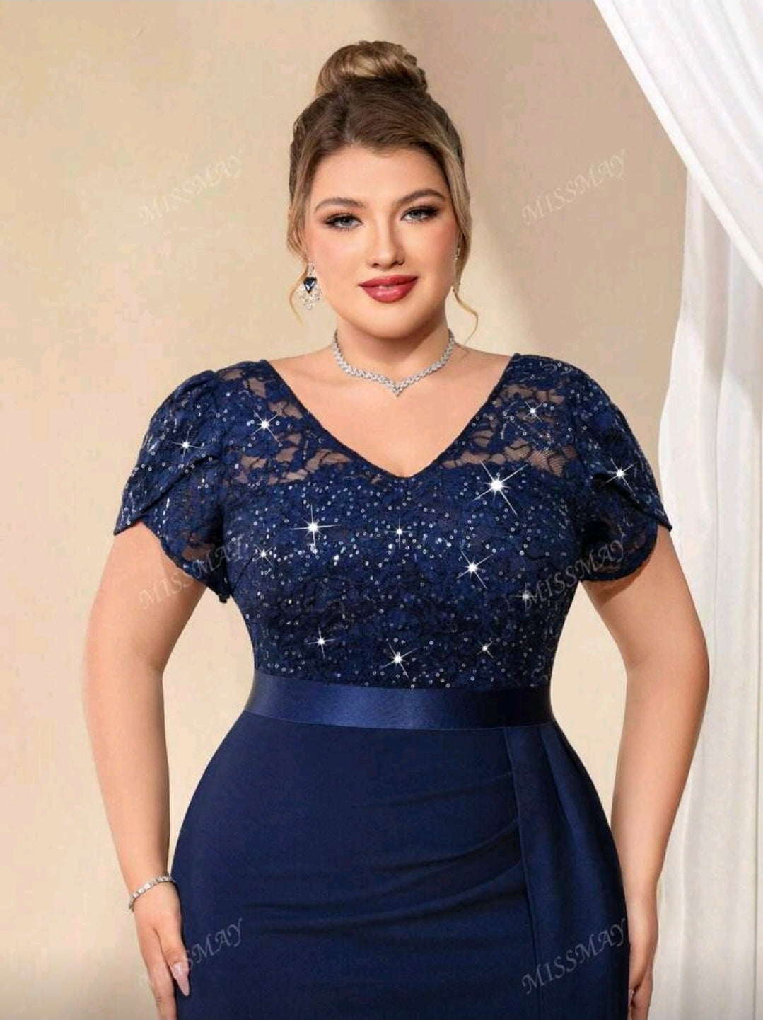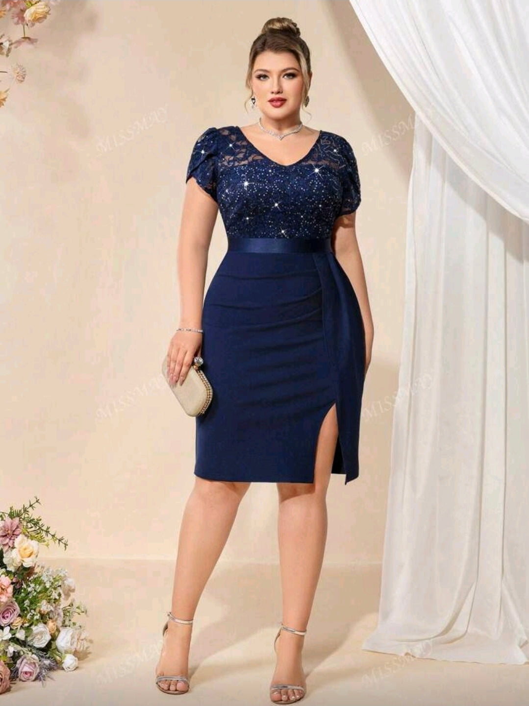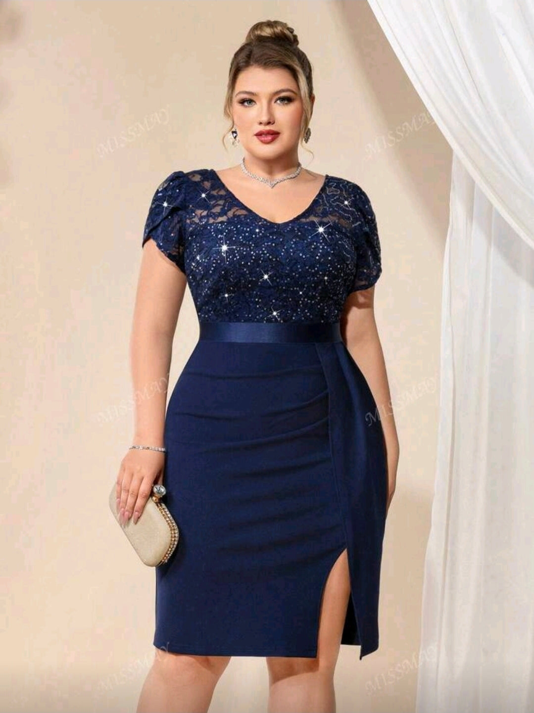 فستان أزرق ضيق مزين بالترتر والدانتيل بتصميم أزهار، بفتحة رقبة على شكل حرف V، بأكمام مكشكشة، وفتحة عند الفخذ.