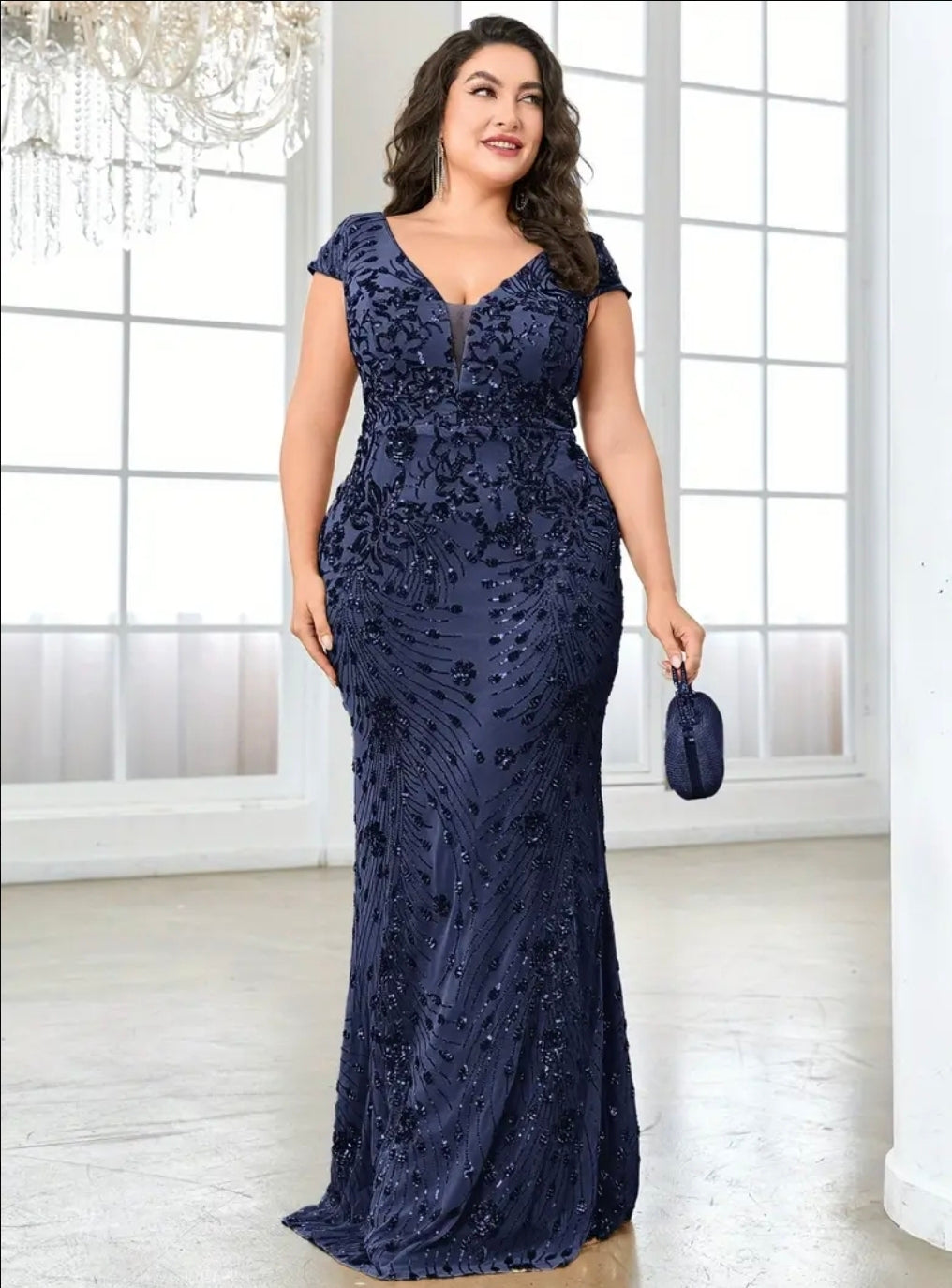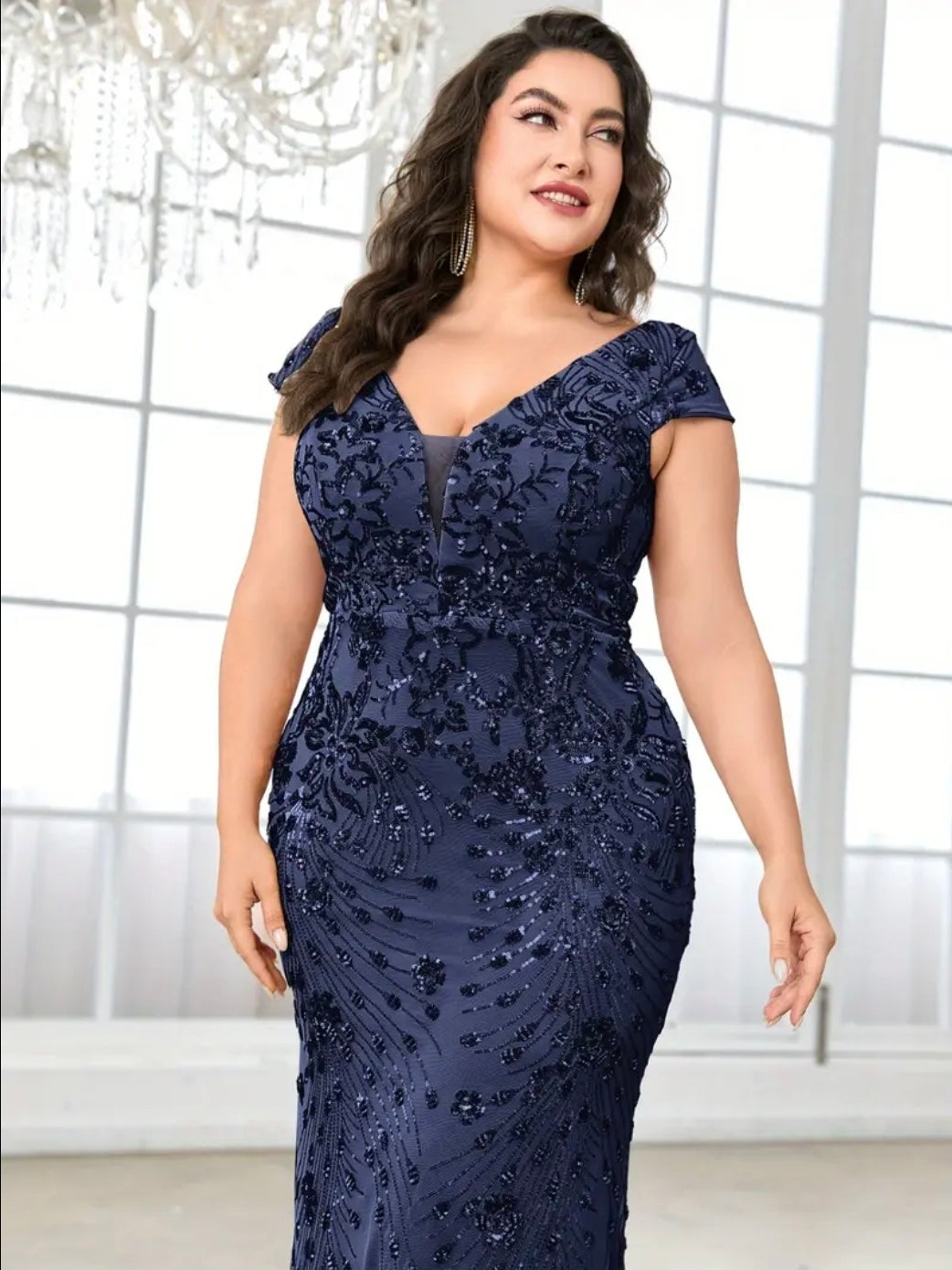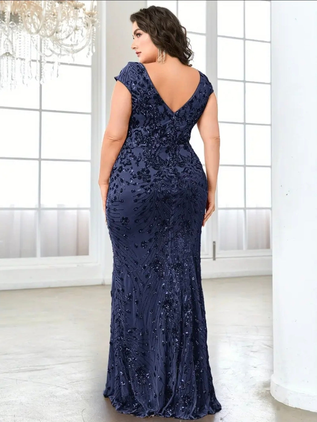 فستان سهرة أنيق ازرق مزين بالترتر للنساء مقاس كبير - رقبة على شكل حرف V، حاشية حورية البحر ملائمة، بدون أكمام