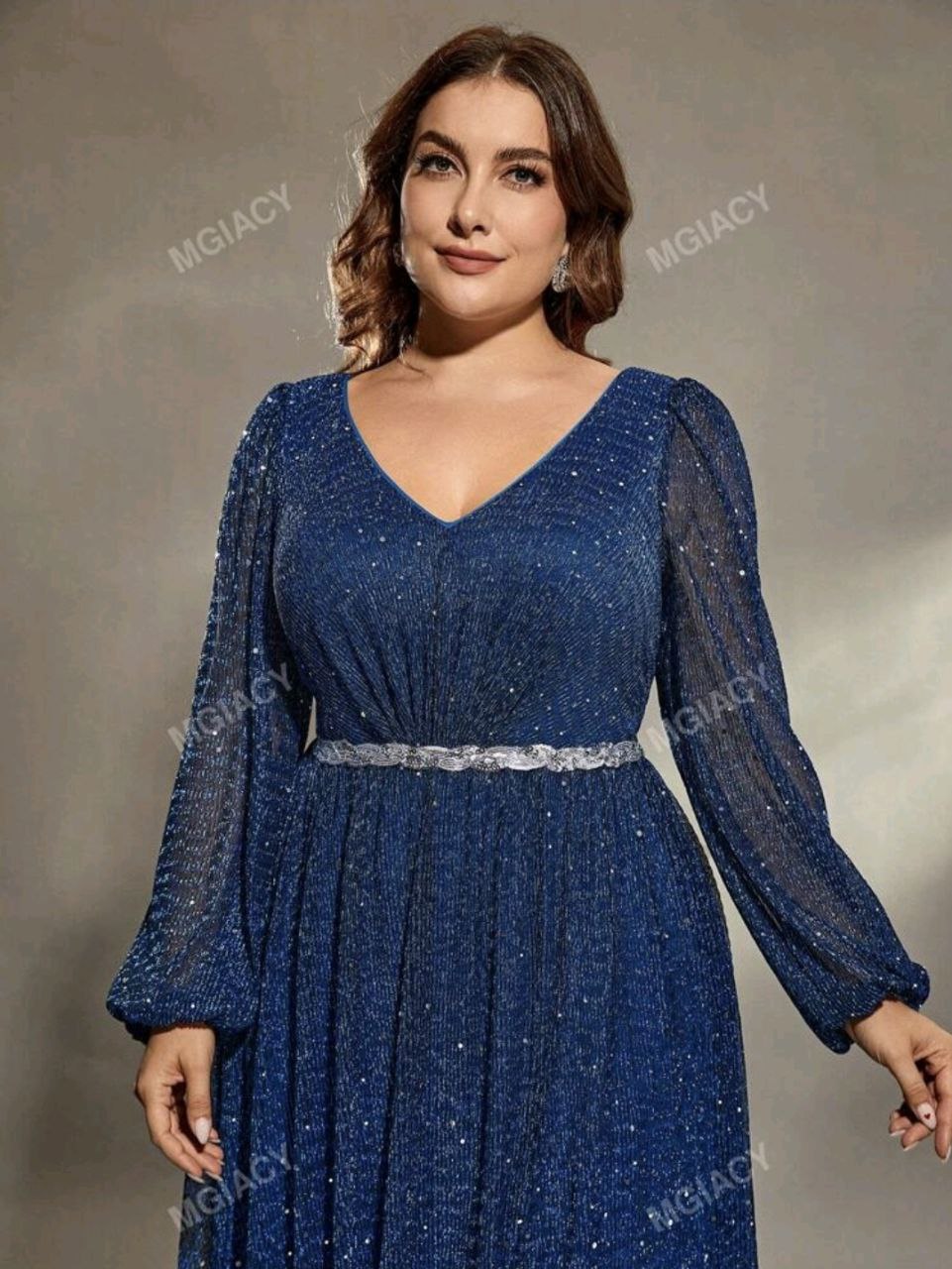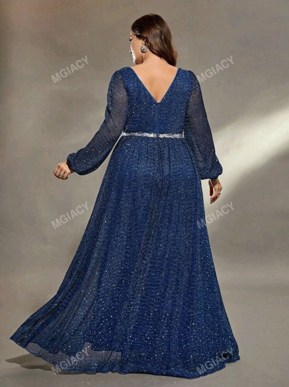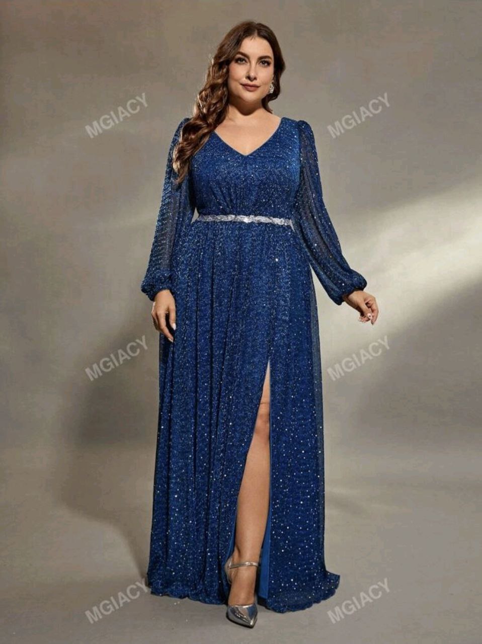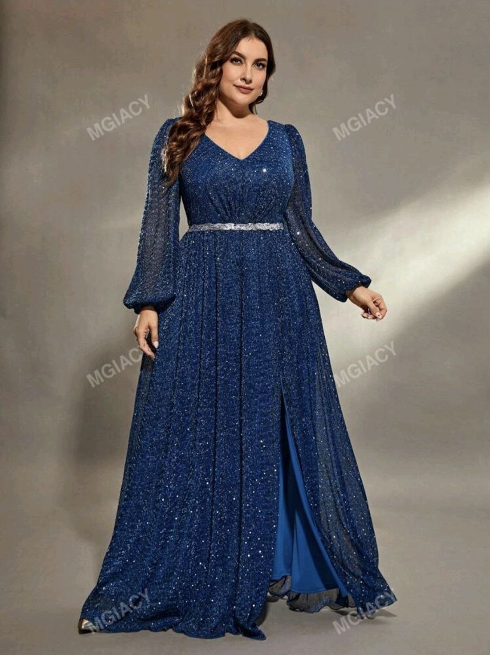 فستان ازرق طويل  فخم مع أكمام طويلة و خصر مزين بالترتر و فتحة فالاسفل