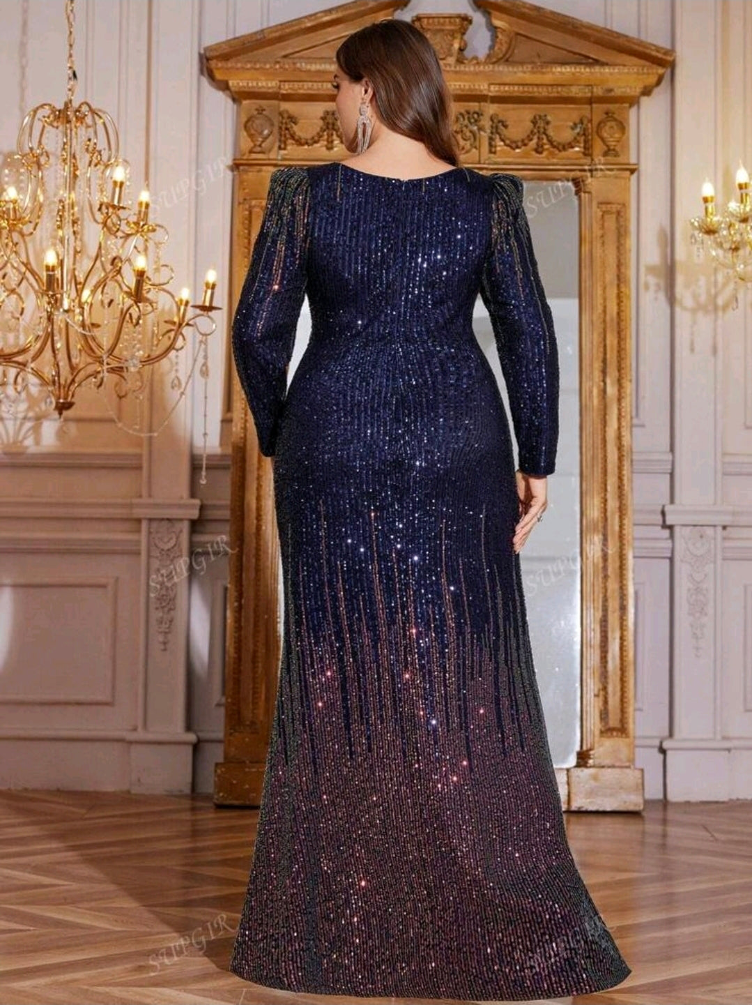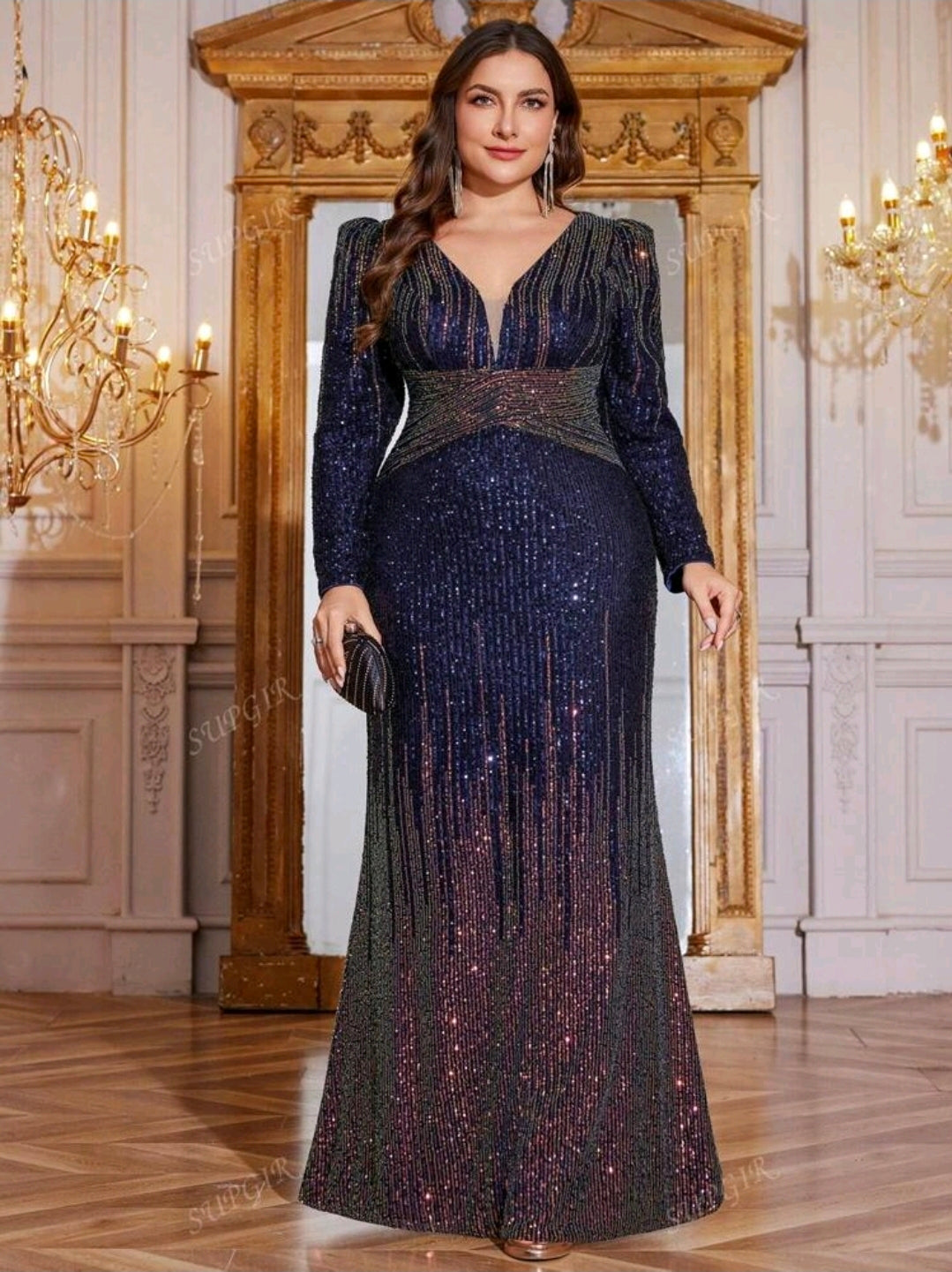 بياقة على شكل حرف V، وأكمام طويلة، ومطرّز بالترتر