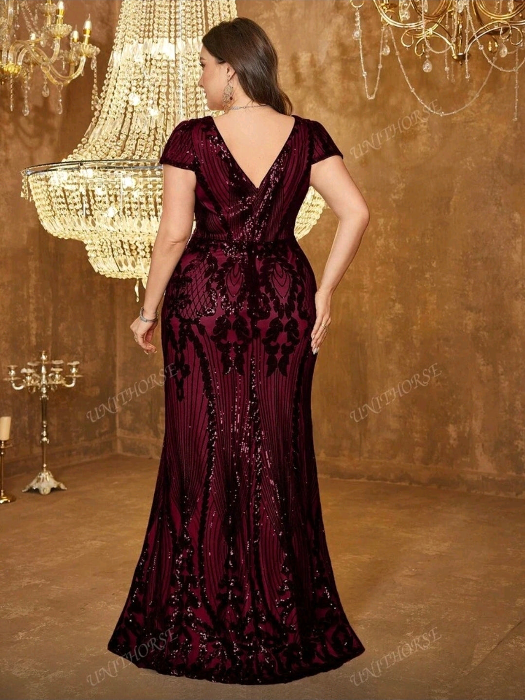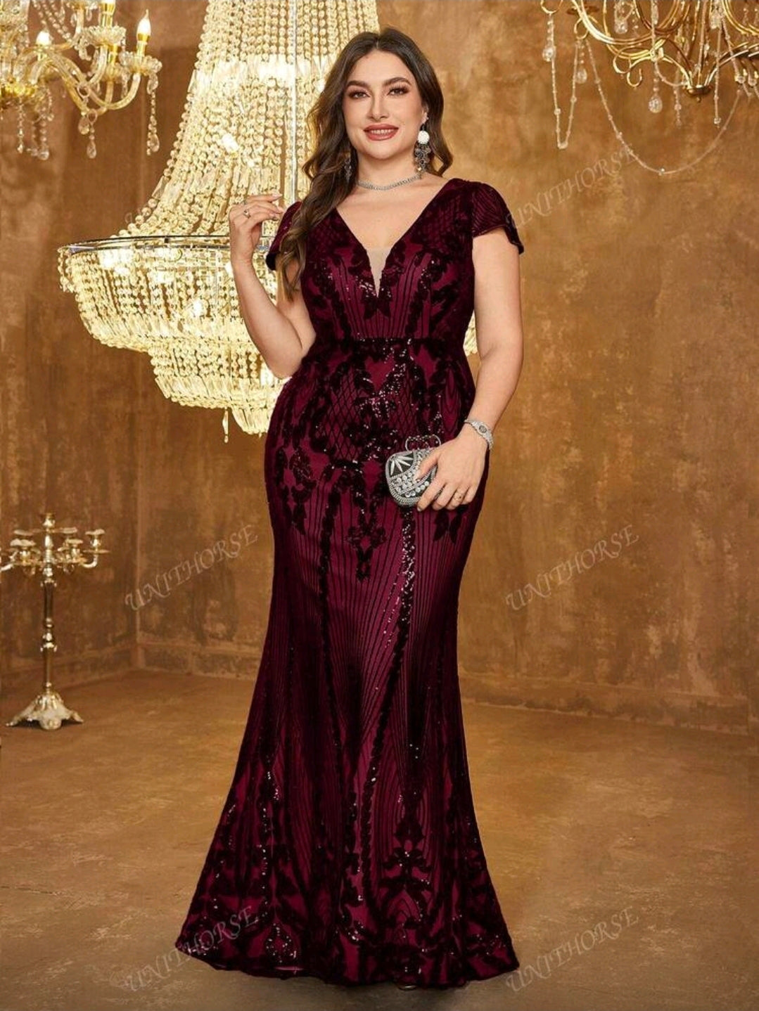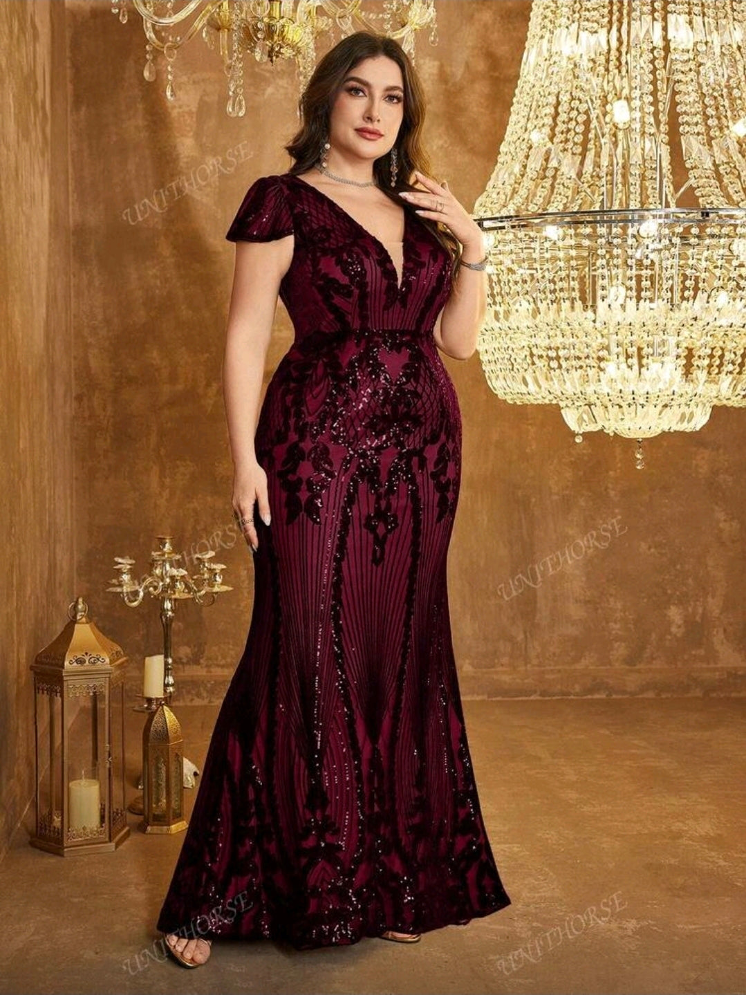 فستان عنابي سهرة أنيق بفتحة رقبة عميقة وحاشية من الترتر الاسود  للمقاسات الكبيرة