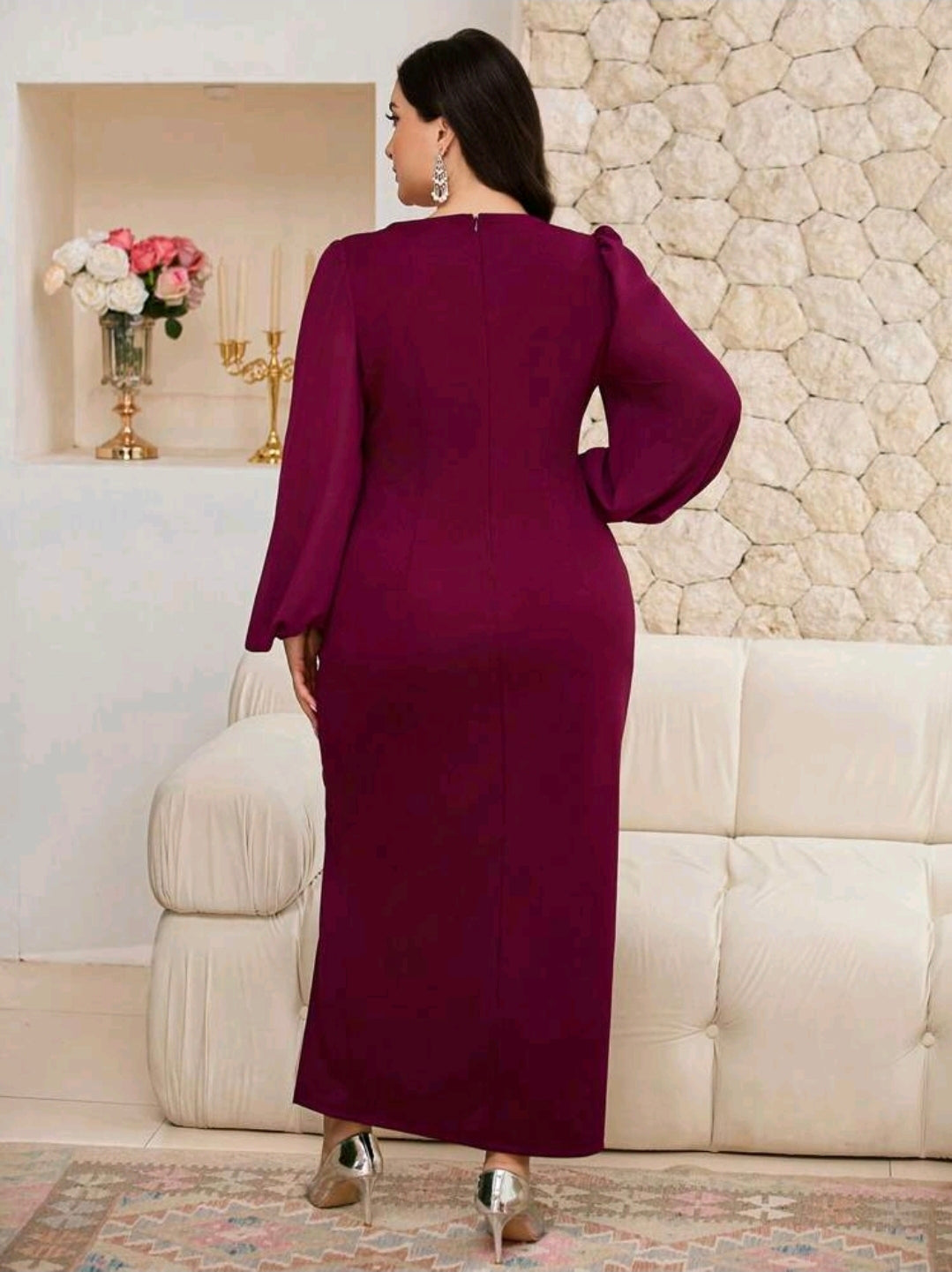 فستان 3/4 عنابي بأكمام طويلة و مزير بأحجار