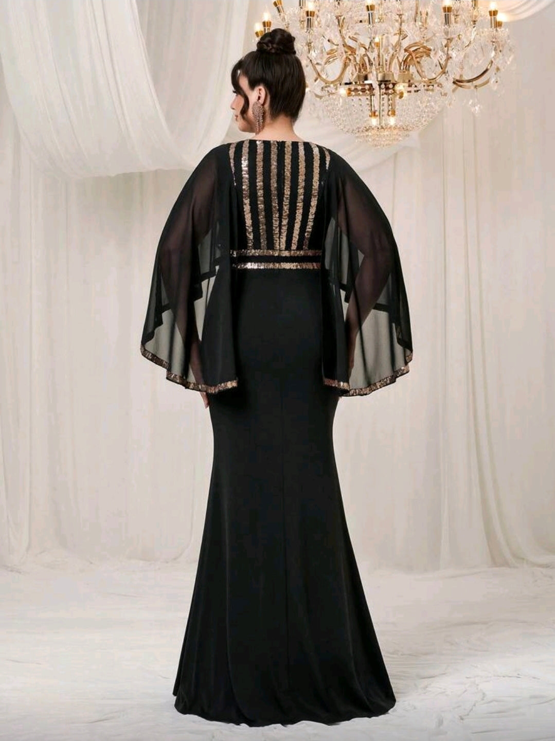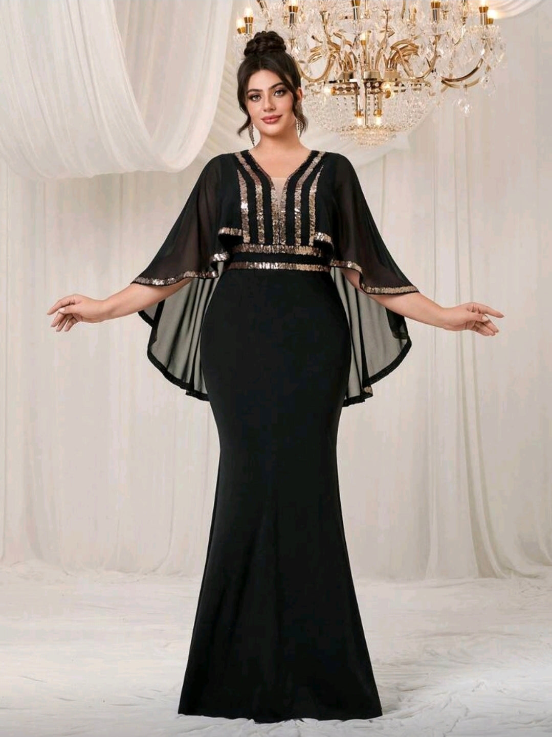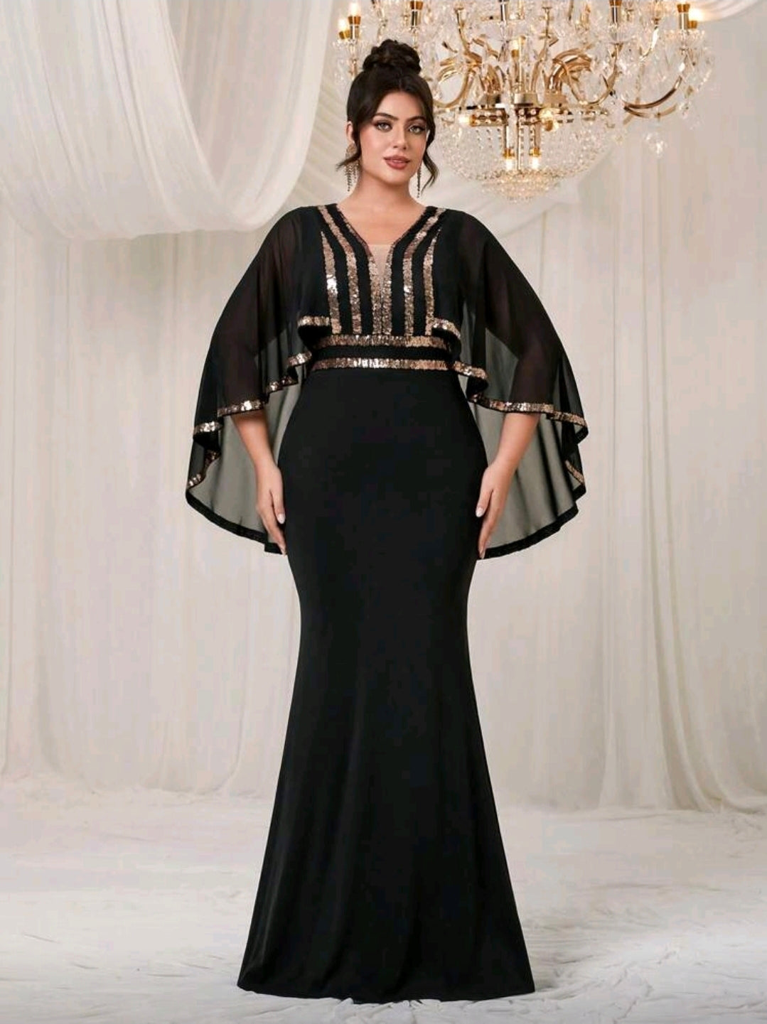 فستان سهرة طويل مع شال من الشيفون المتباين ، برقبة على شكل حرف V بمقاس كبير
