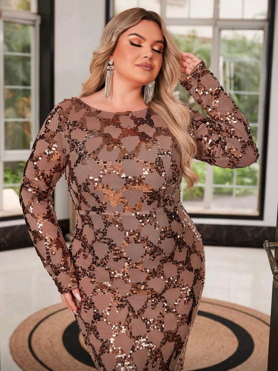 فستان سهرة أنيق بأكمام طويلة ورقبة دائرية ومقاس كبير مزين بالترتر