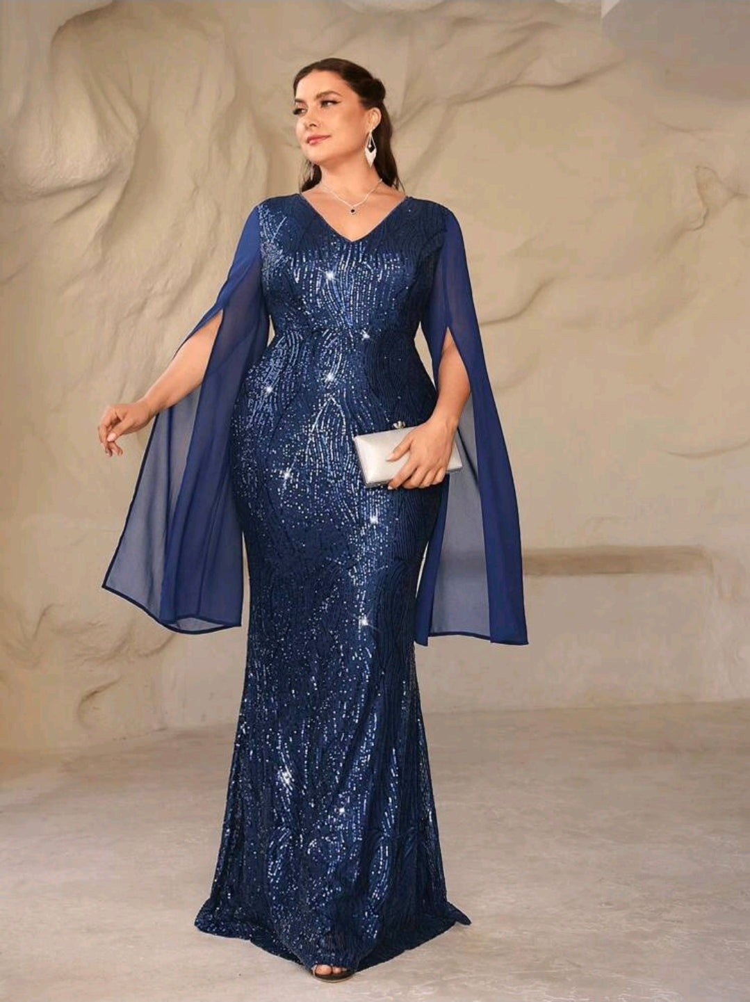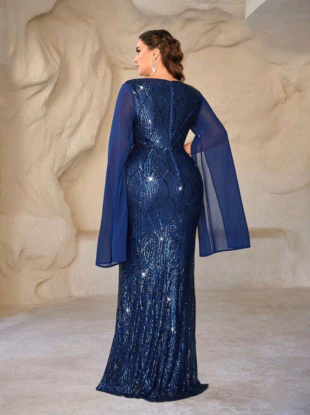 فستان طويل أزرق  أنيق مع ترتر متباين باللون الأزرق البحري مع اكمام طويلة مفتوحة
