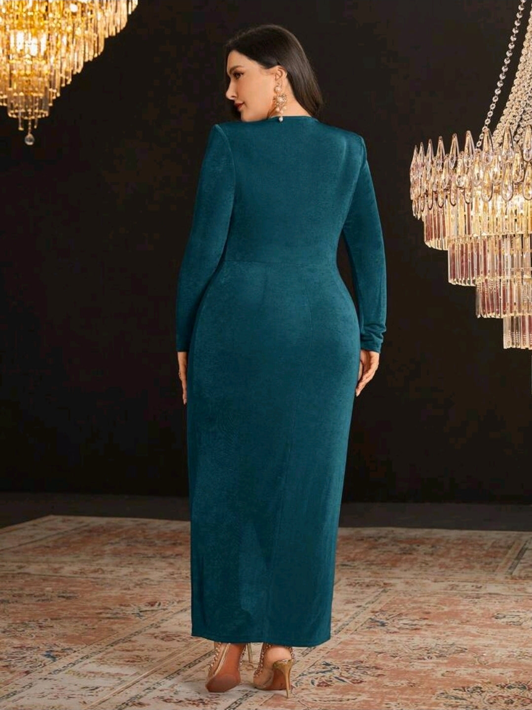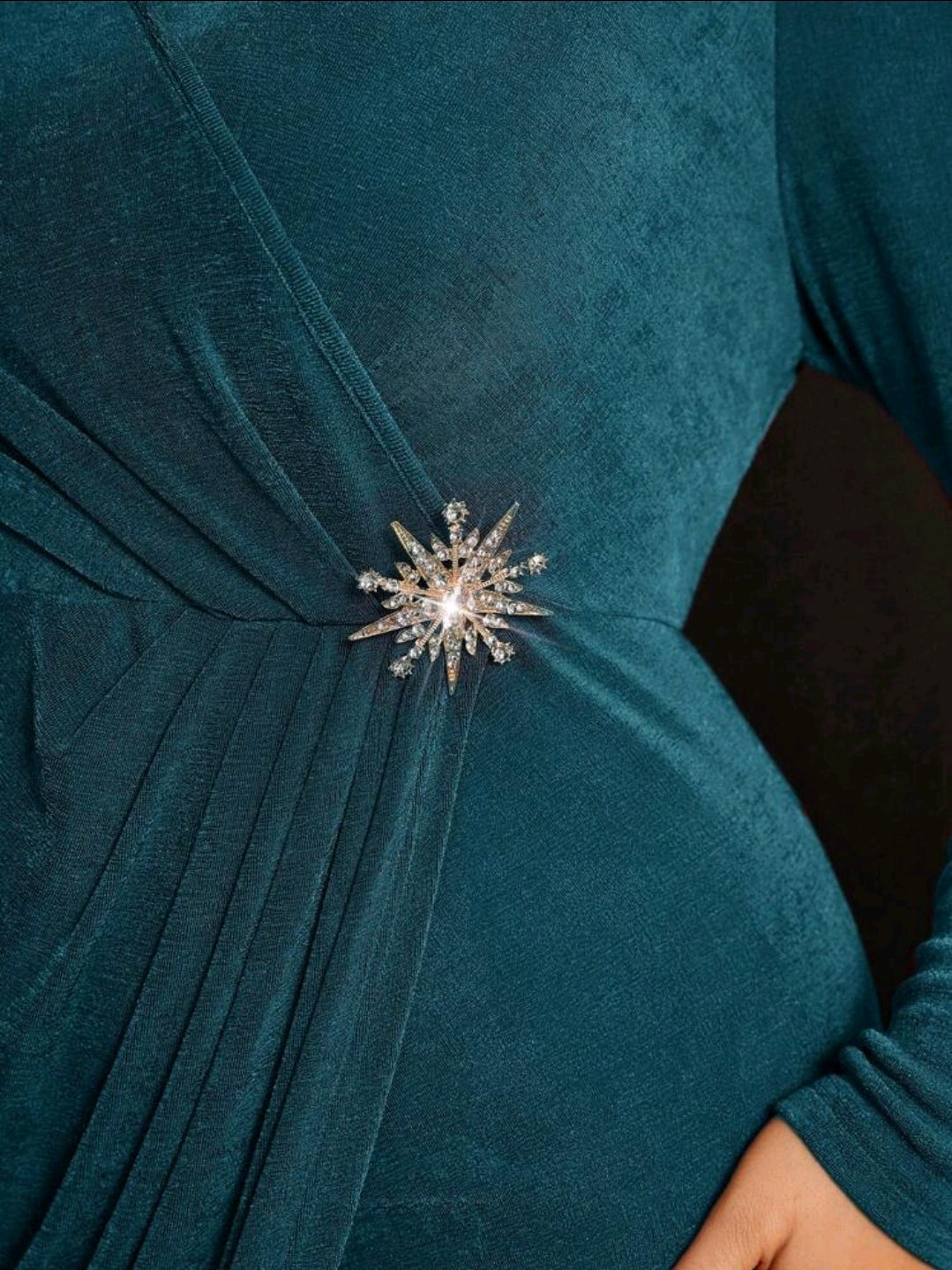 فستان أنيق بأكمام طويلة خصر مشدود مزين ببروش و رقبة مفتوحة شكل V