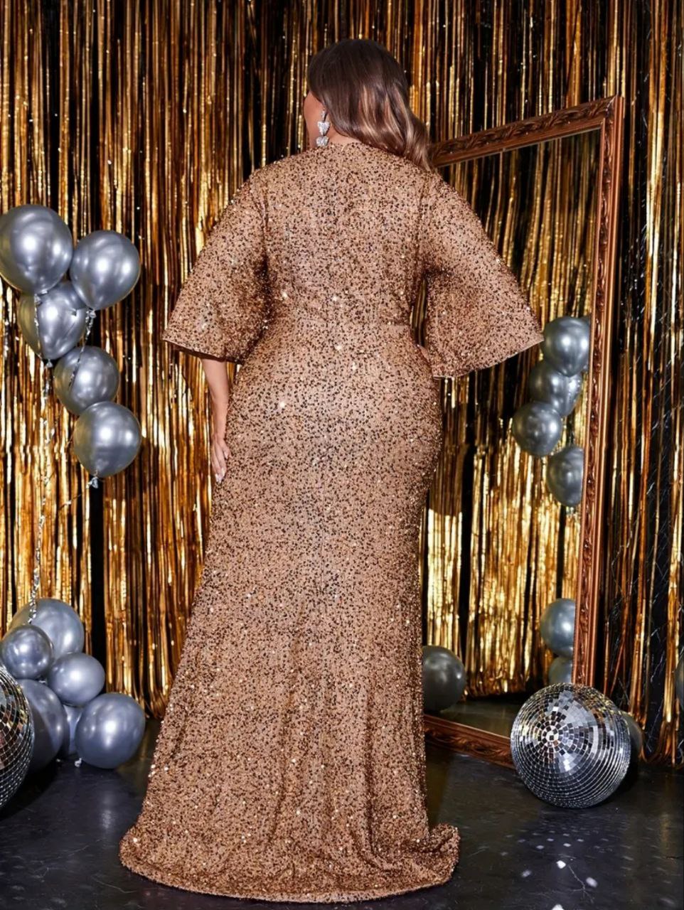فستان ذهبي فاخر بأكمام 3/4 مفتوحة و فتحة رقبة عميقة مزين كامل بالترتر