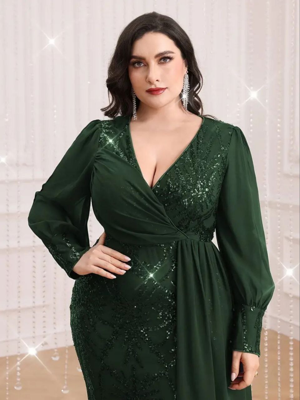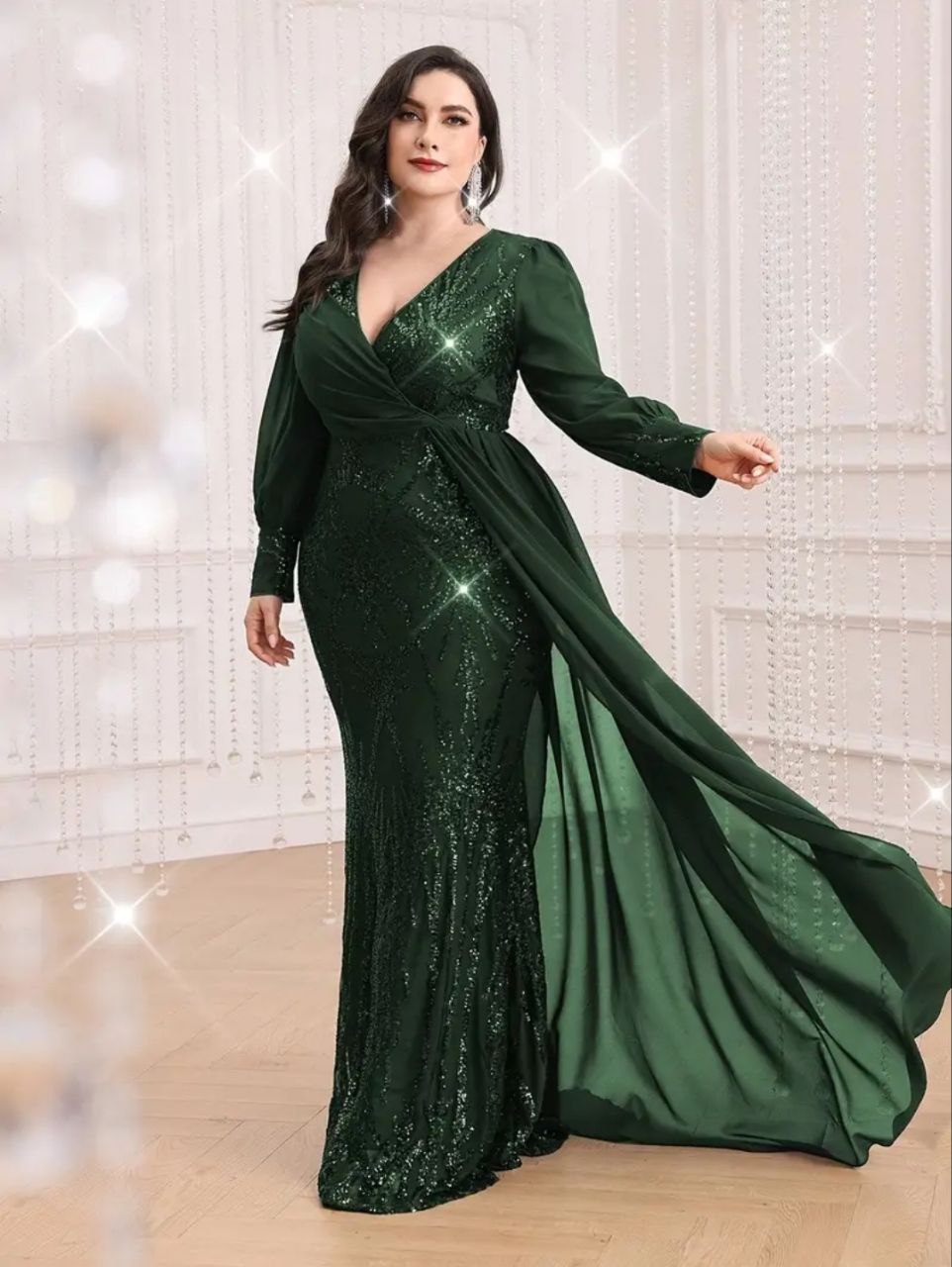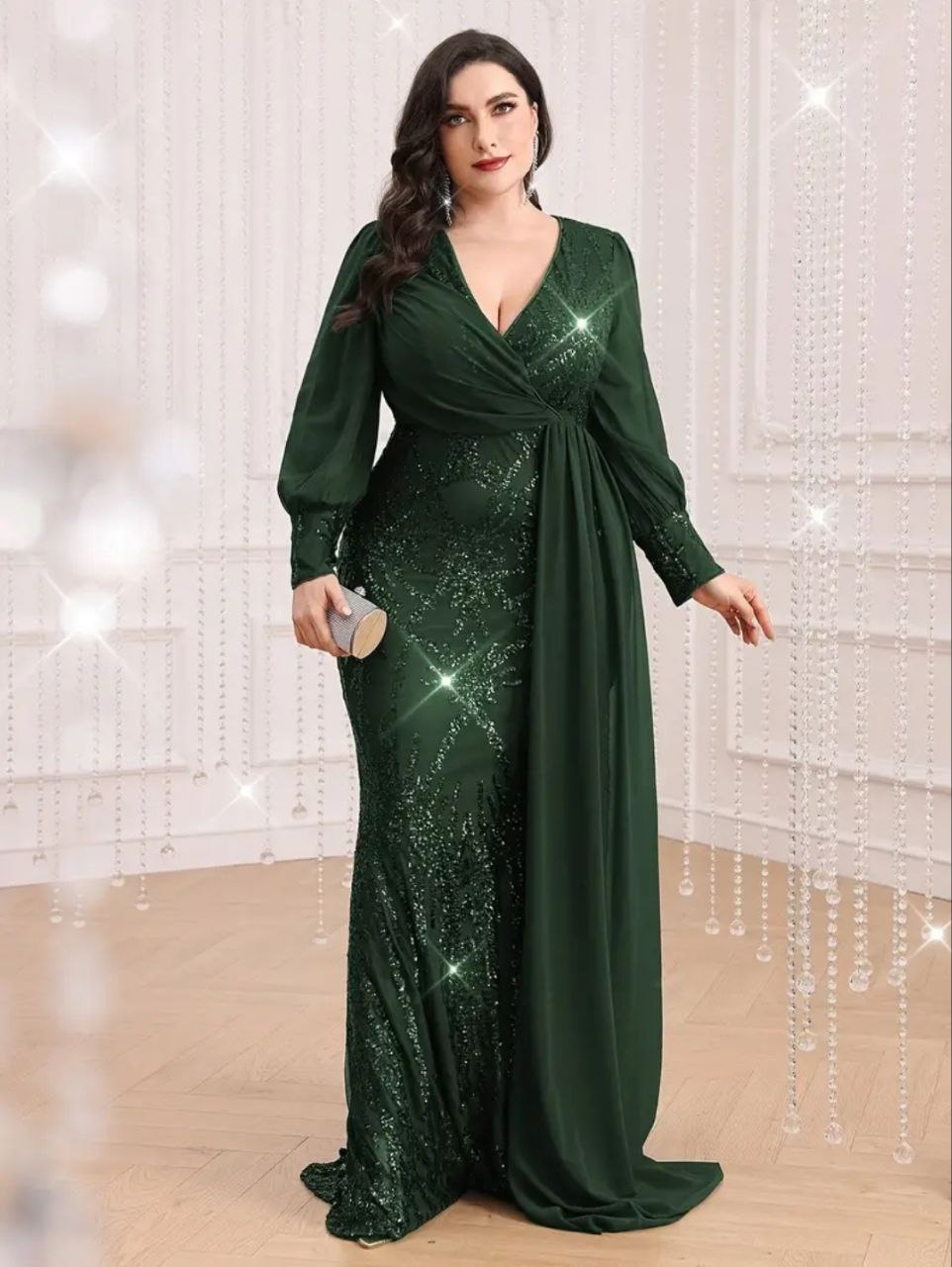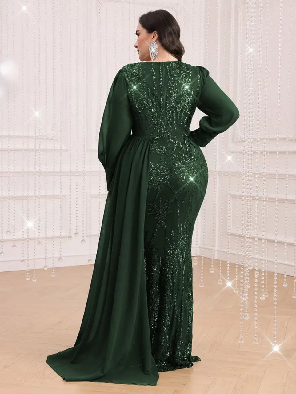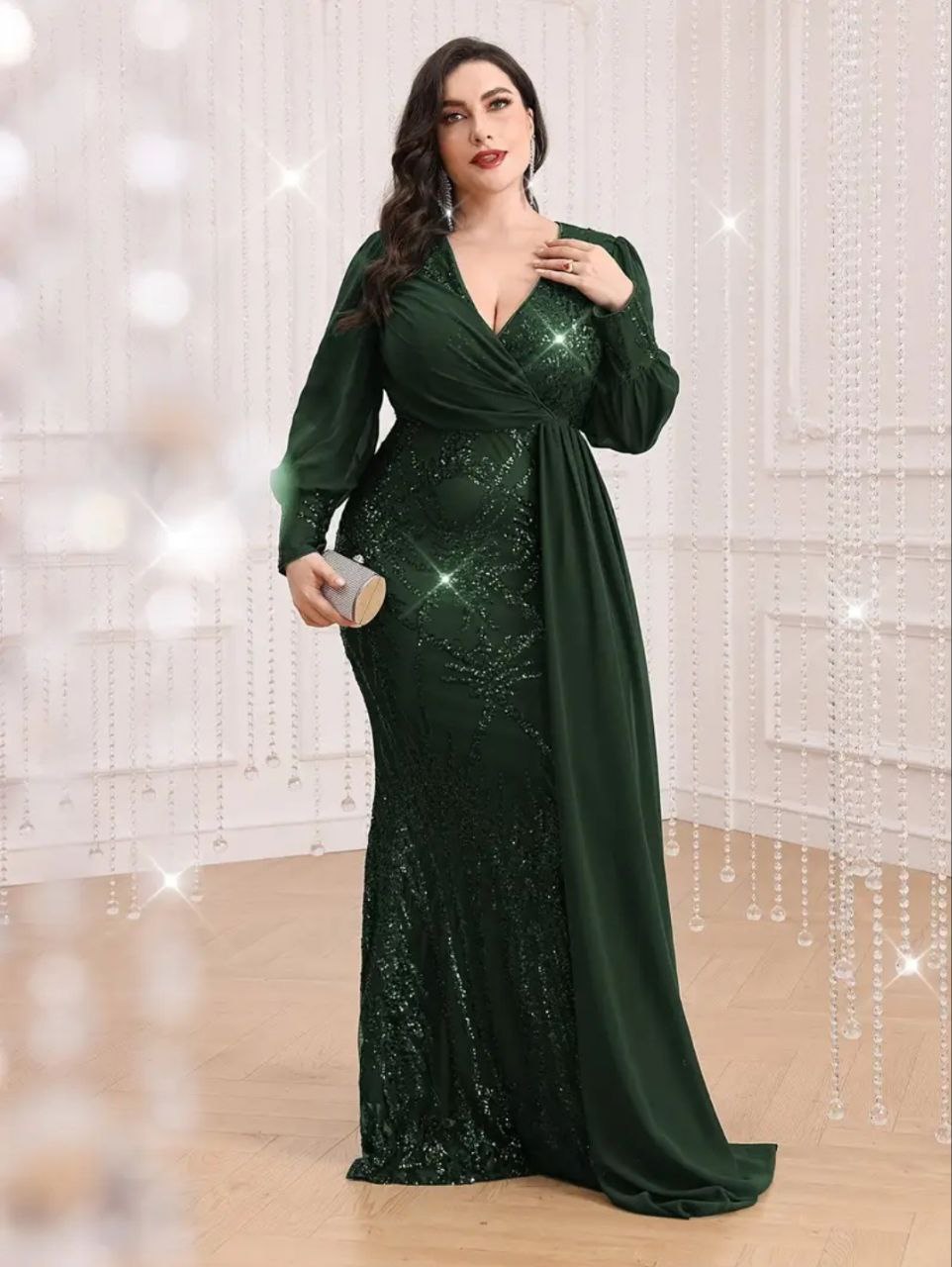 فستان أخضر فاخر و أنيق بأكمام طويلة مزين كامل بالترتر