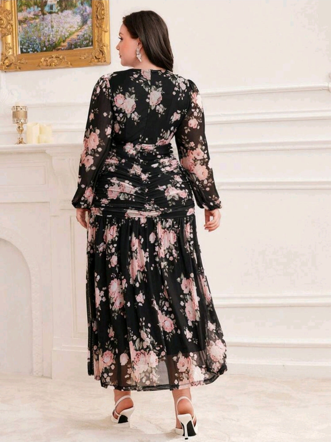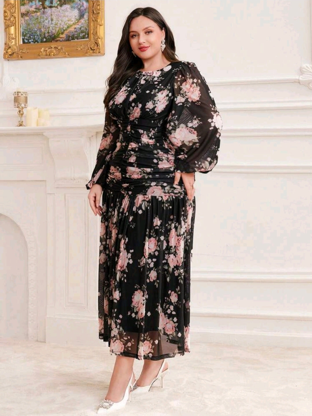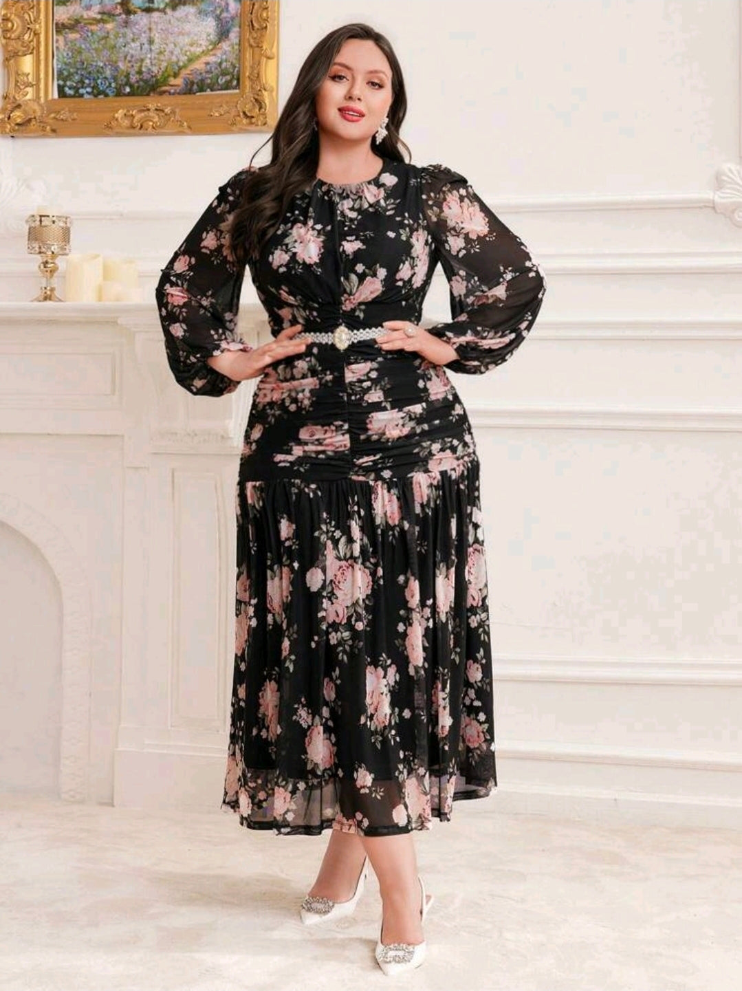فستان مزين بالزهور بأكمام فانوس وطبقات فالخصر