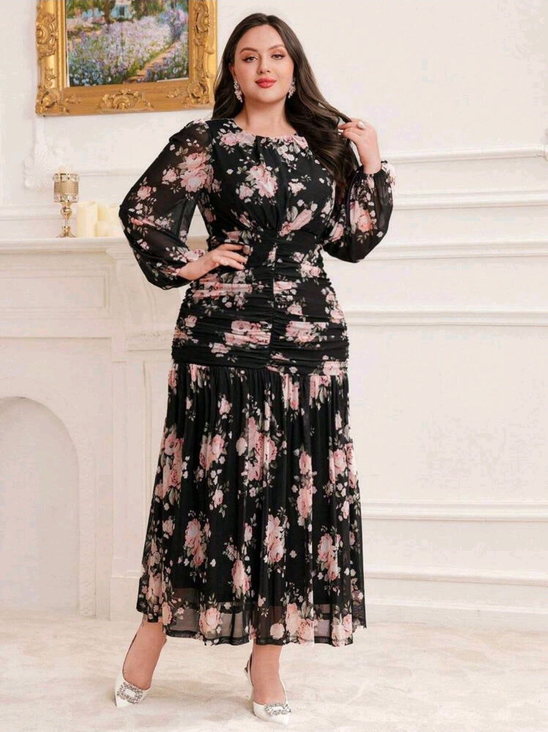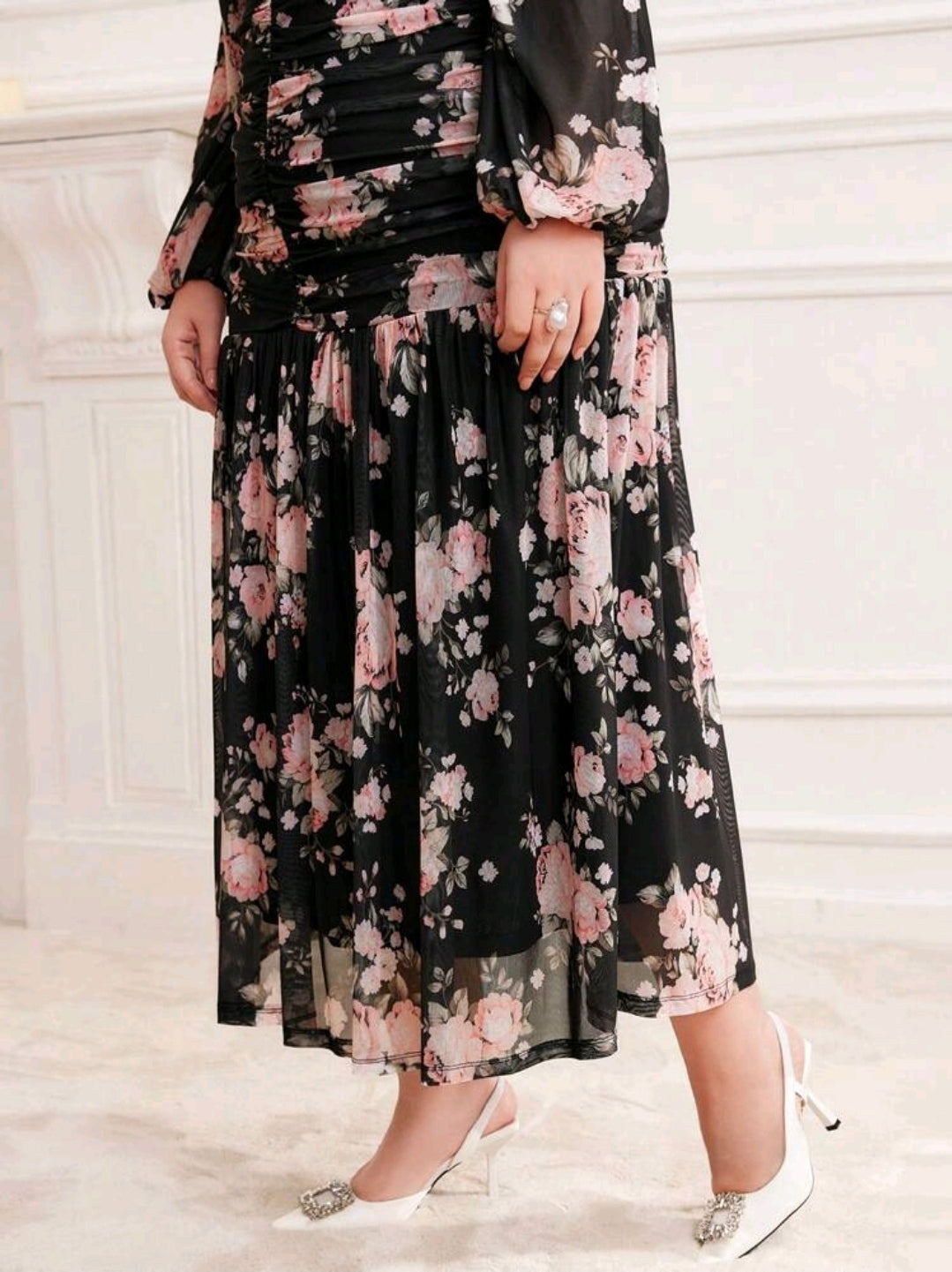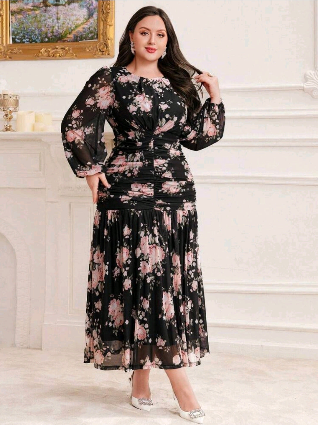 فستان مزين بالزهور بأكمام فانوس وطبقات فالخصر