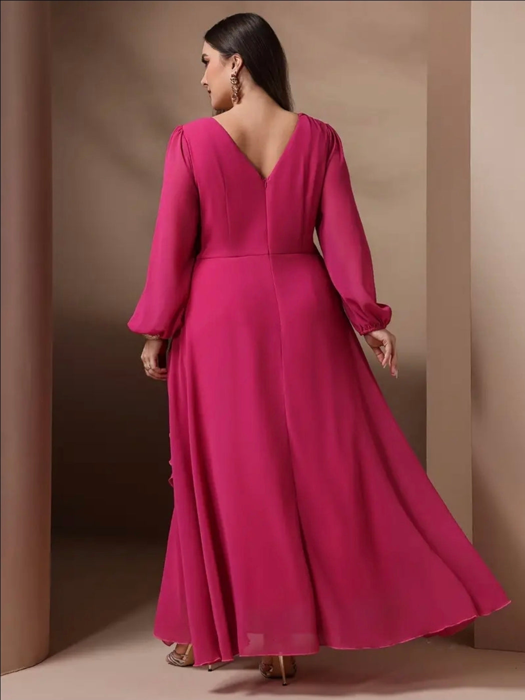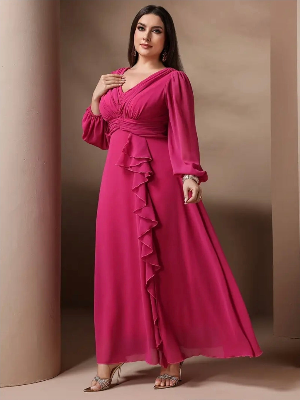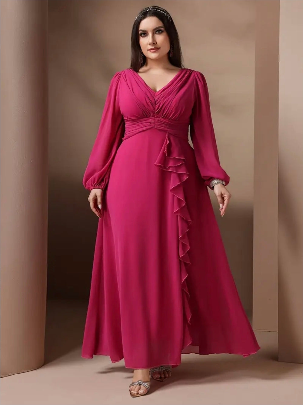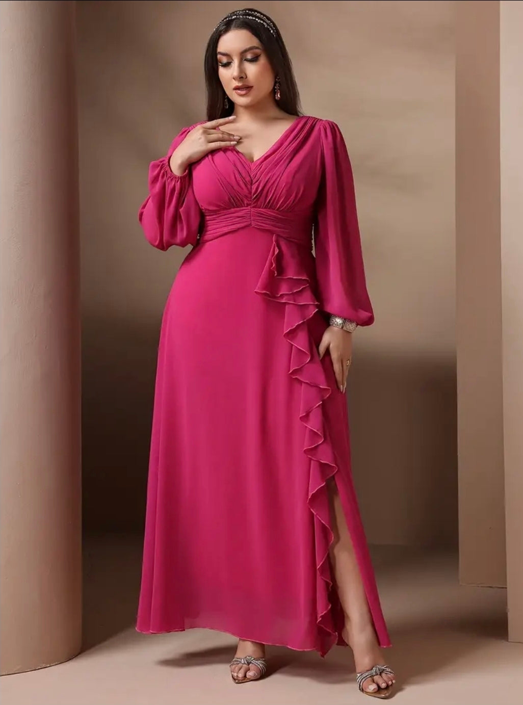 فستان وردي بأكمام طويلة و كشكشة فالصدر و الخصر ، بلون سادة